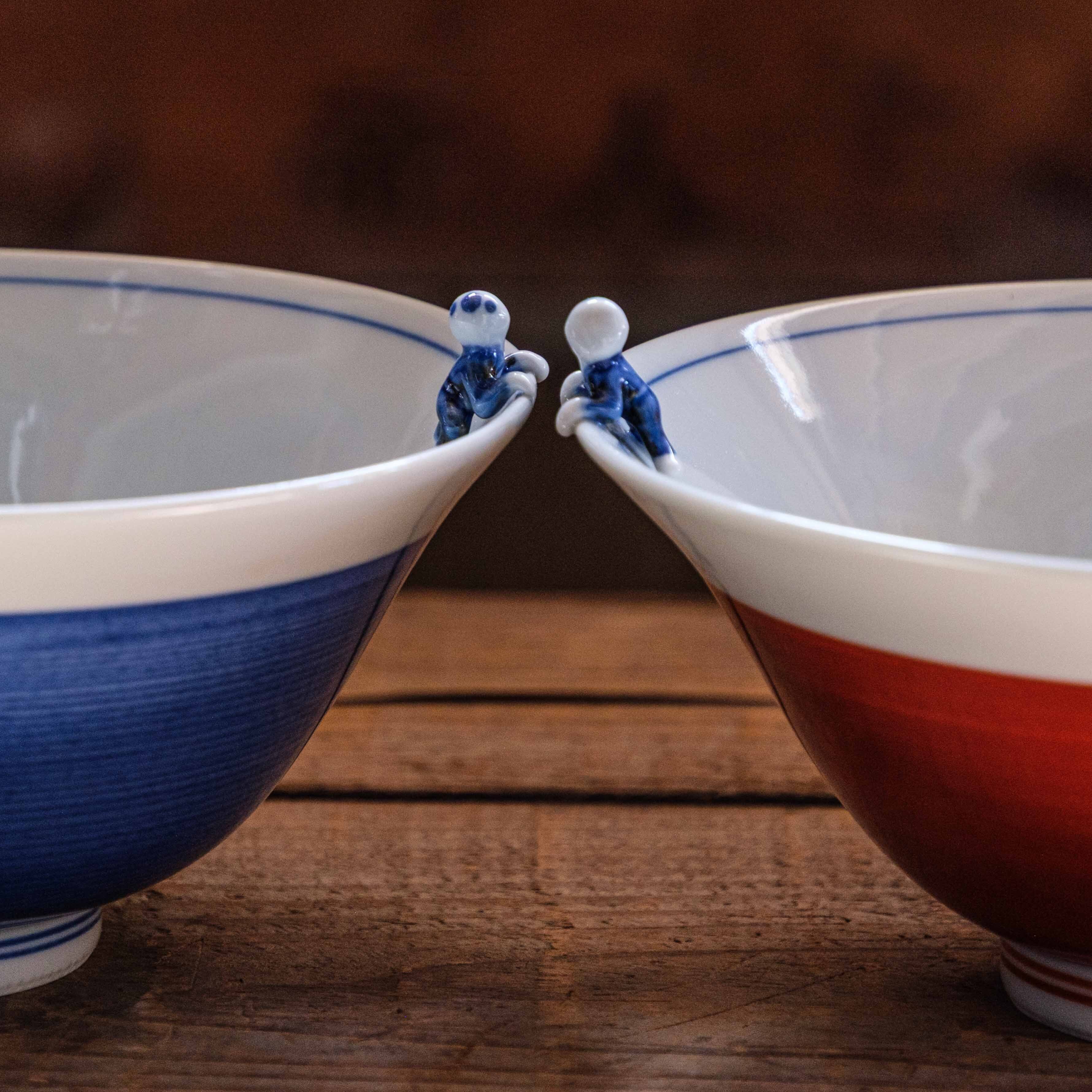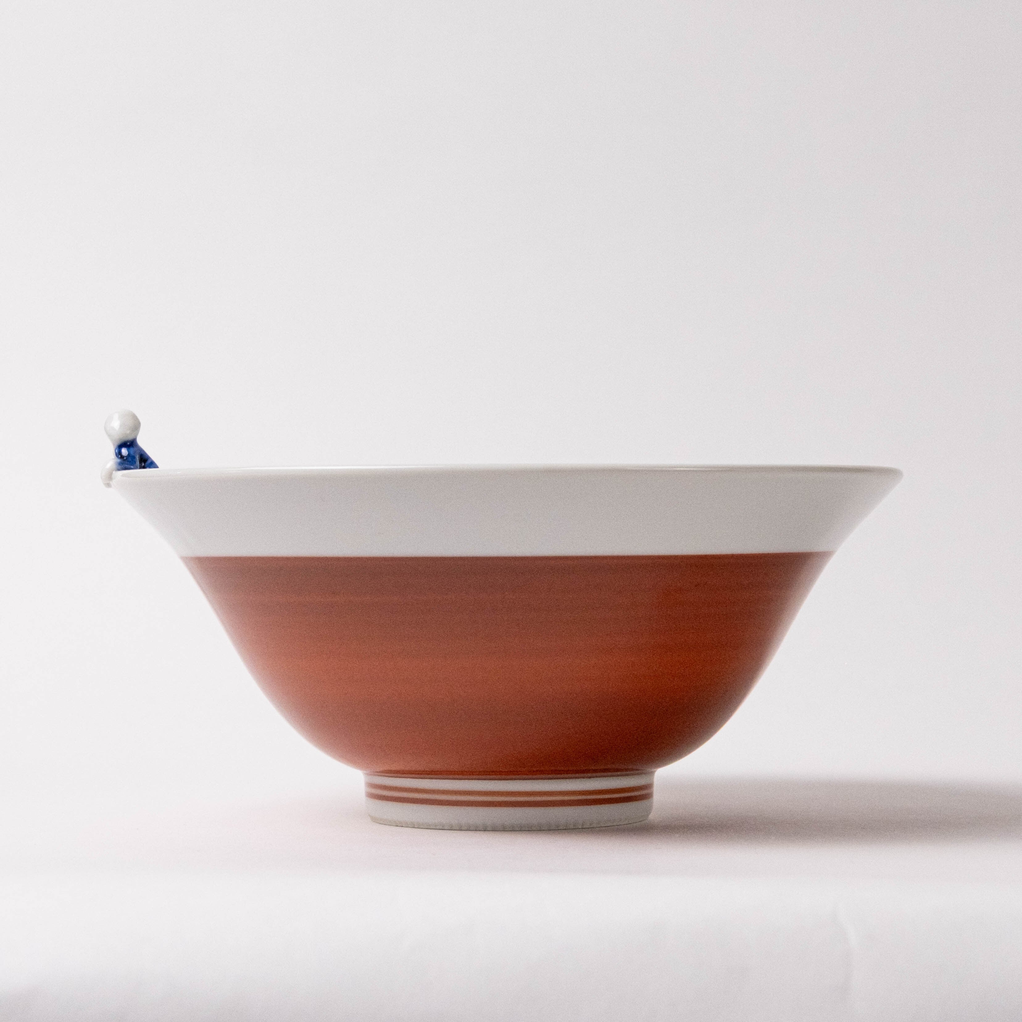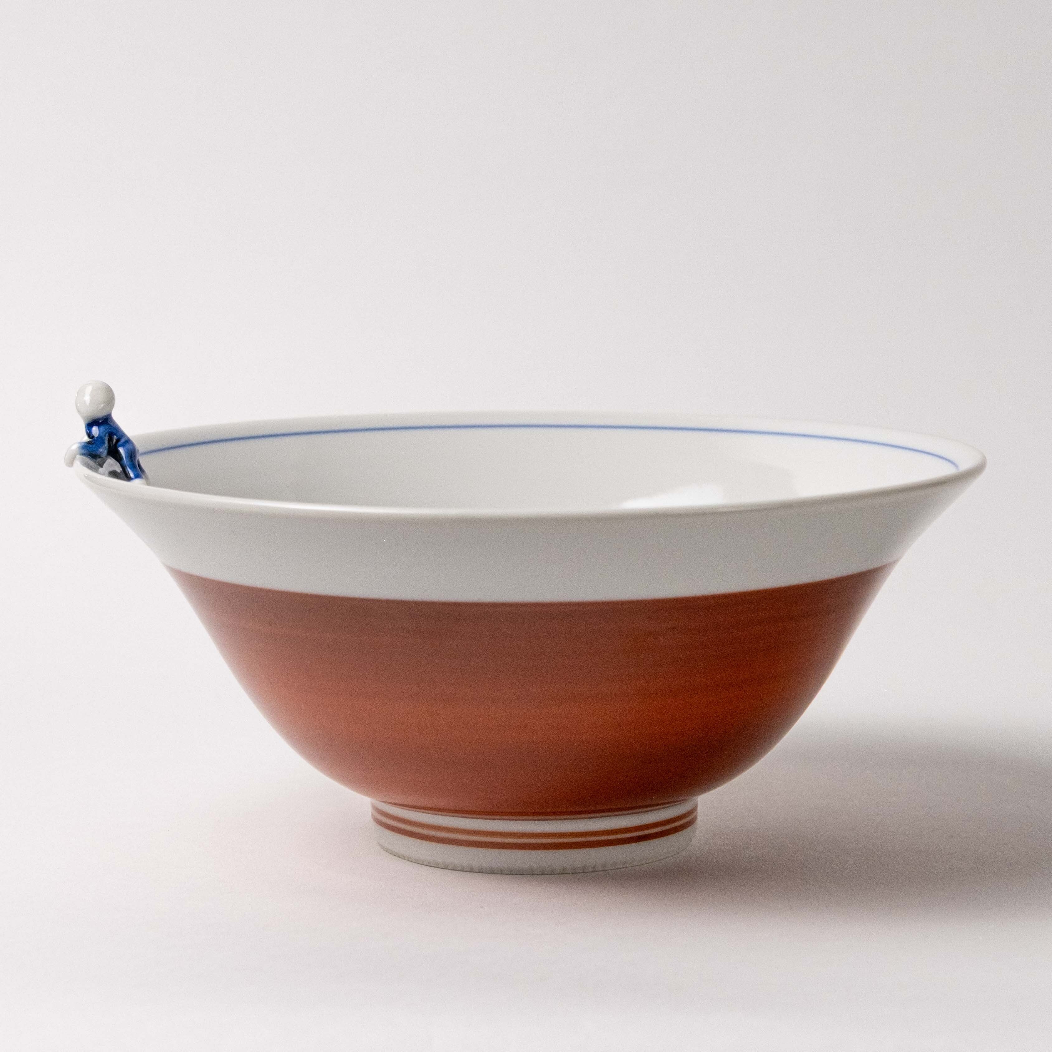 一般的なインスタント袋麺の容量に合わせた家庭向けのラーメン鉢を考えました。長右衛門窯で作り続けている一閑人付盃を大きくしたようなデザインです。一閑人がスープに落ちないように必死にしがみついています。また、この一閑人はレンゲが鉢の中に落ちないよう、ストッパーとしても機能します。