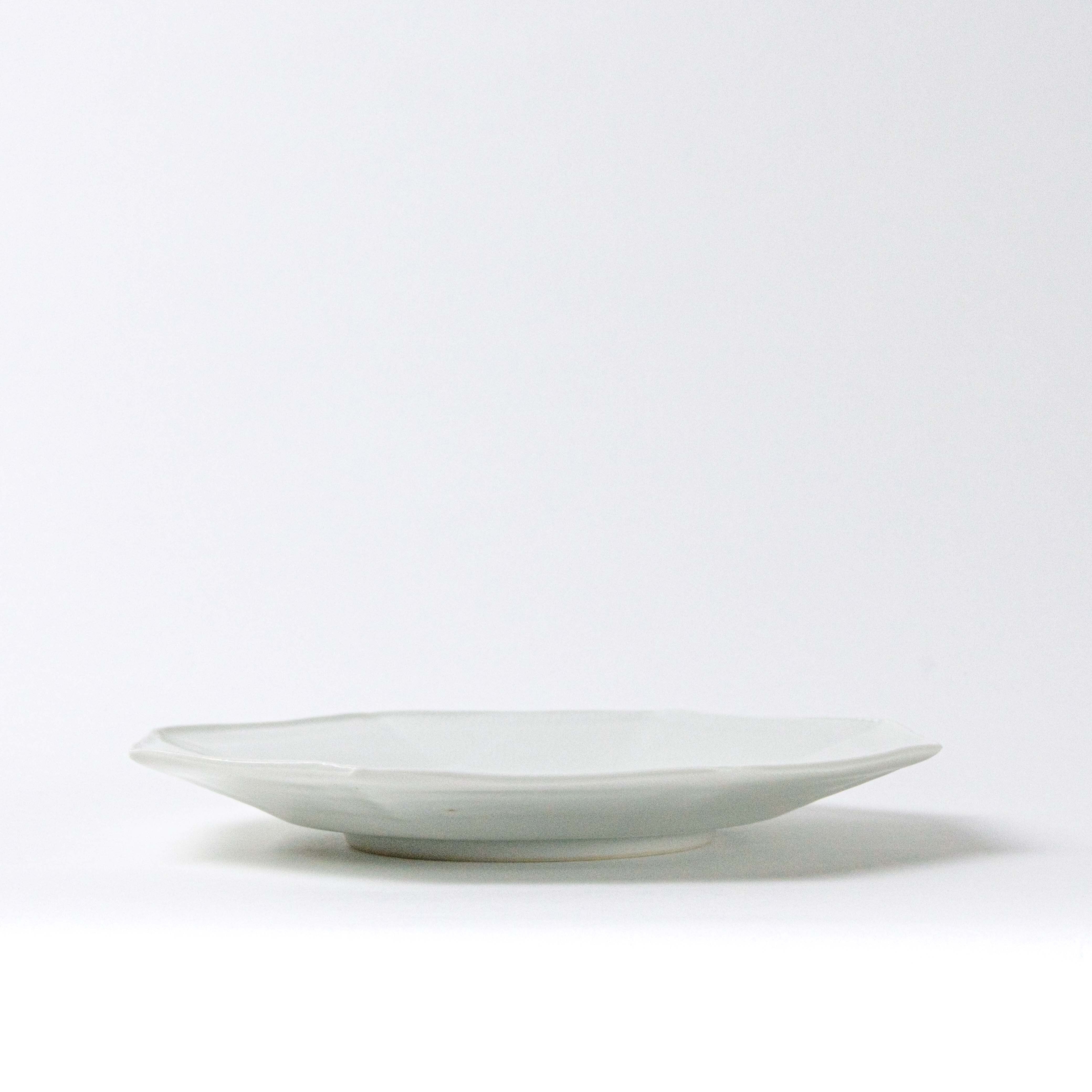 本品は「型打(かたうち)」という技法で、轆轤成形した素地を柔らかい状態で型に押し当てて成形しています。繊細なフォルムが作る事ができるのが特徴で、圧力鋳込にはない手作業ならではの痕跡を感じていただけます。ろくろでは基本的に上から見ると丸い形が得意ですが、型打ちでは丸みを帯びつつも少し変形した、表情のある形をつくることができます。