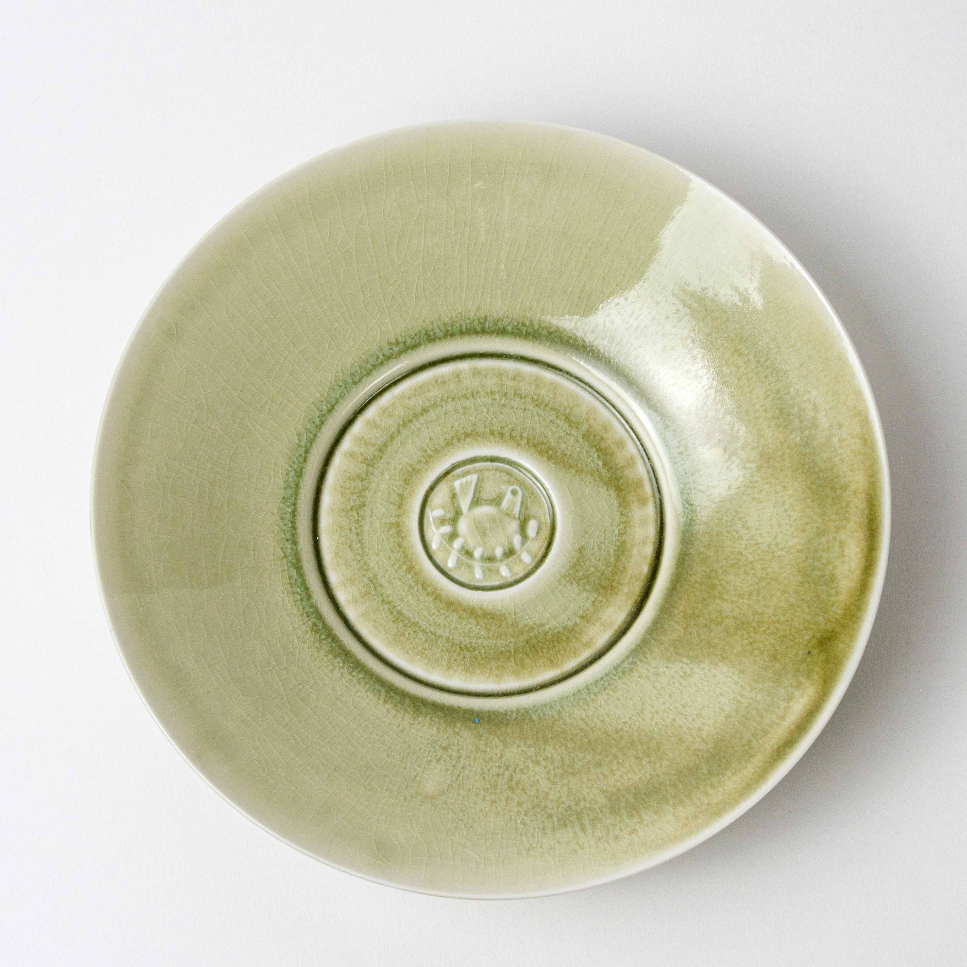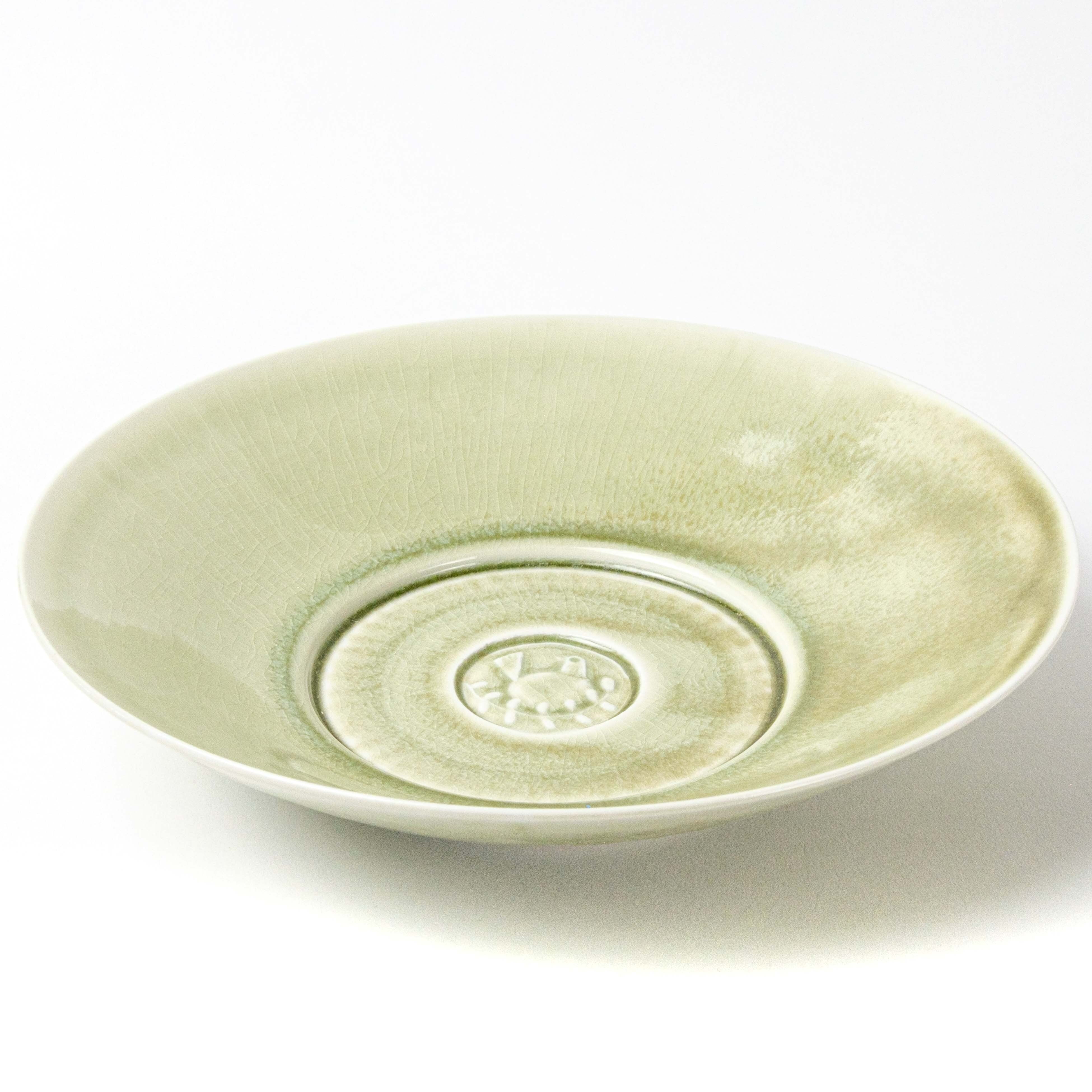 パスタやカレーが盛り付けられるお皿として作りましたが、主菜やフルーツなど様々なものに使い勝手よく、食卓での使用頻度が高い器です。上出が彫ったハンコを見込の中央に刻印しています。