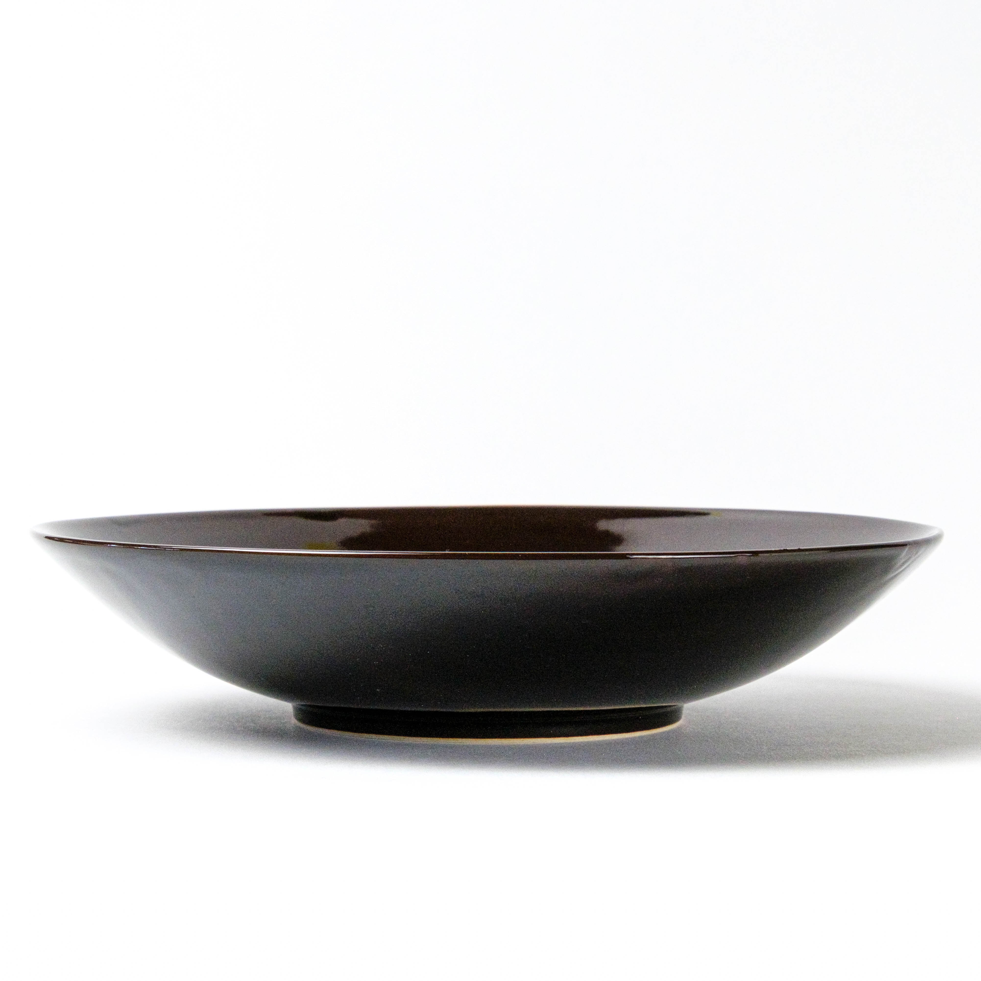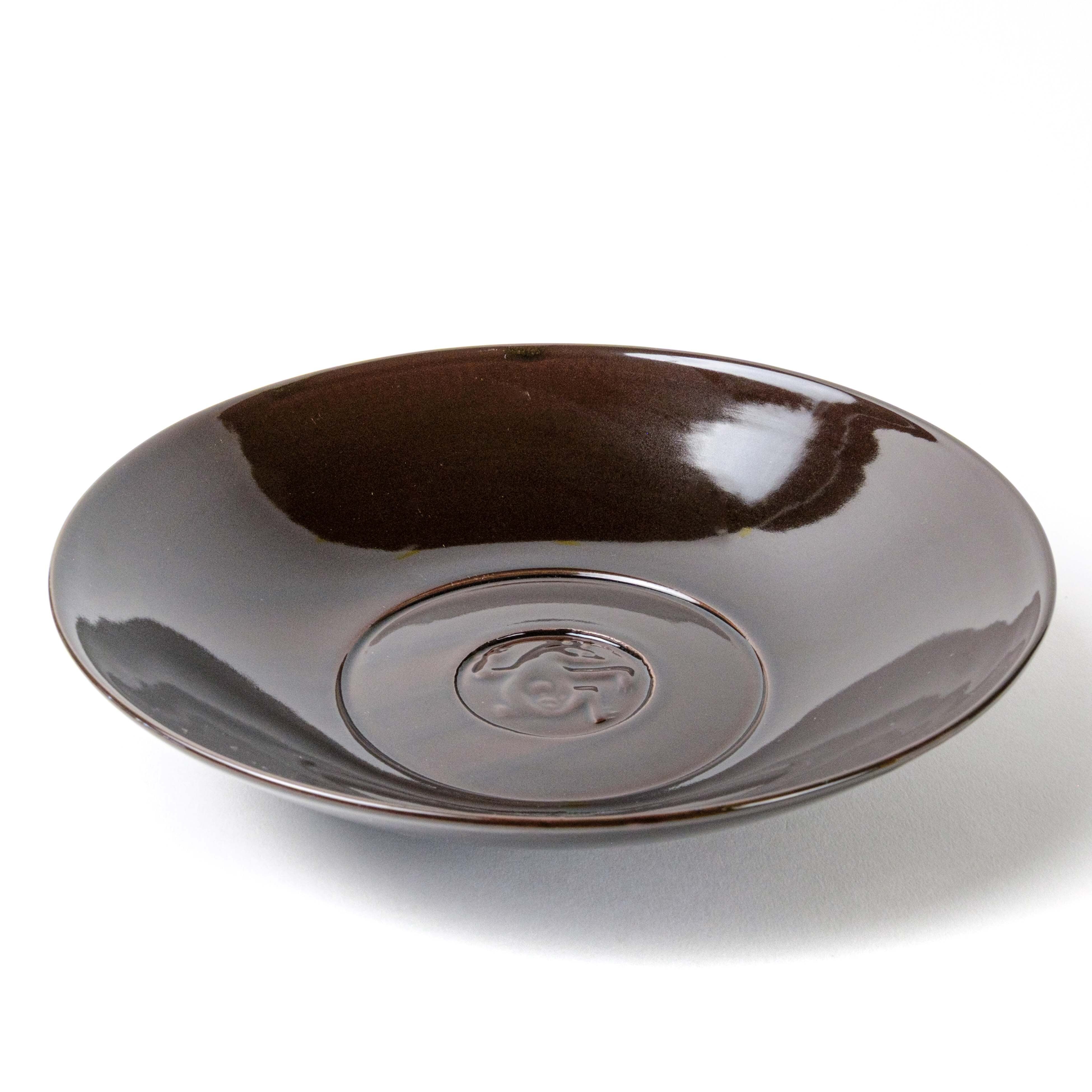パスタやカレーが盛り付けられるお皿として作りましたが、主菜やフルーツなど様々なものに使い勝手よく、食卓での使用頻度が高い器です。上出が彫ったハンコを見込の中央に刻印しています。