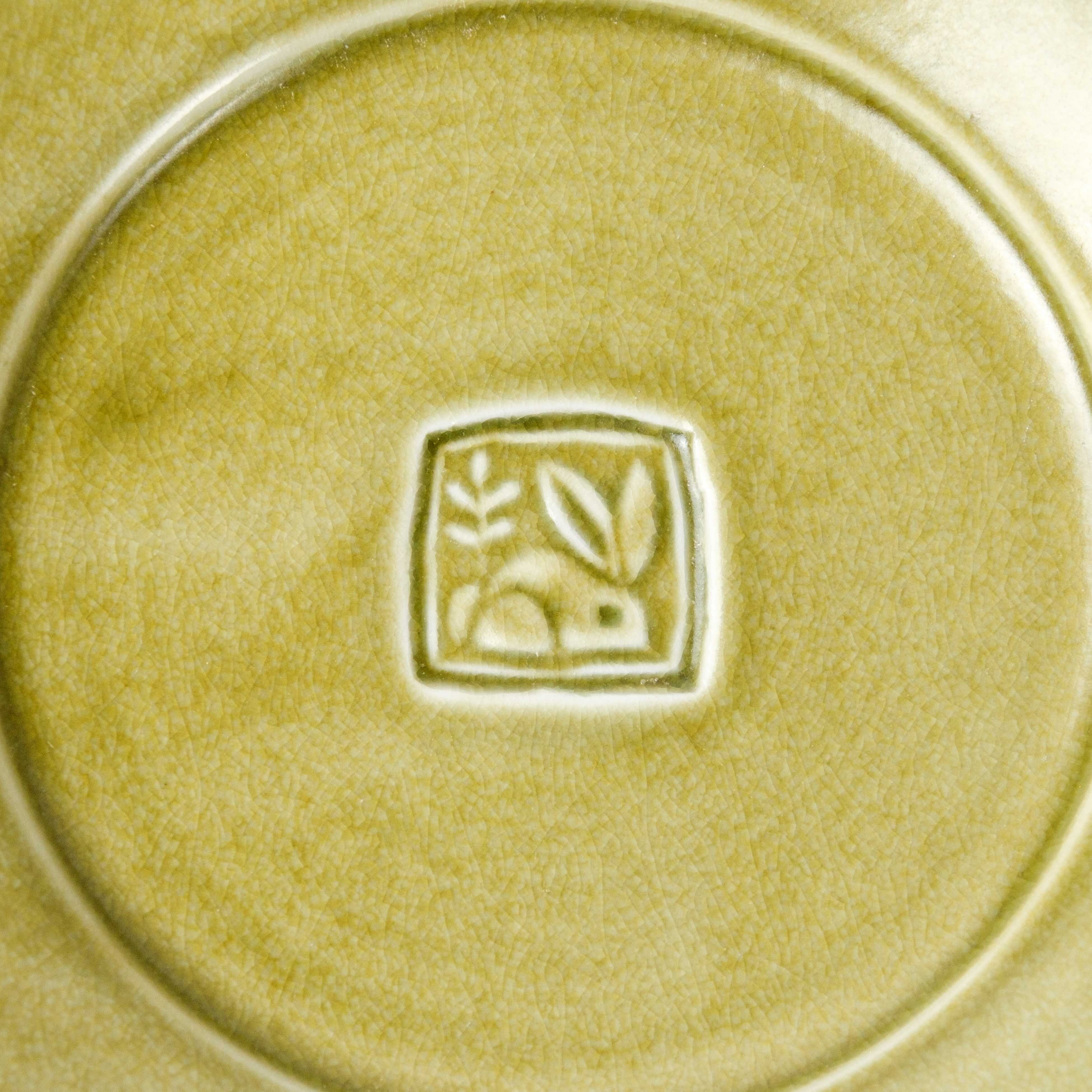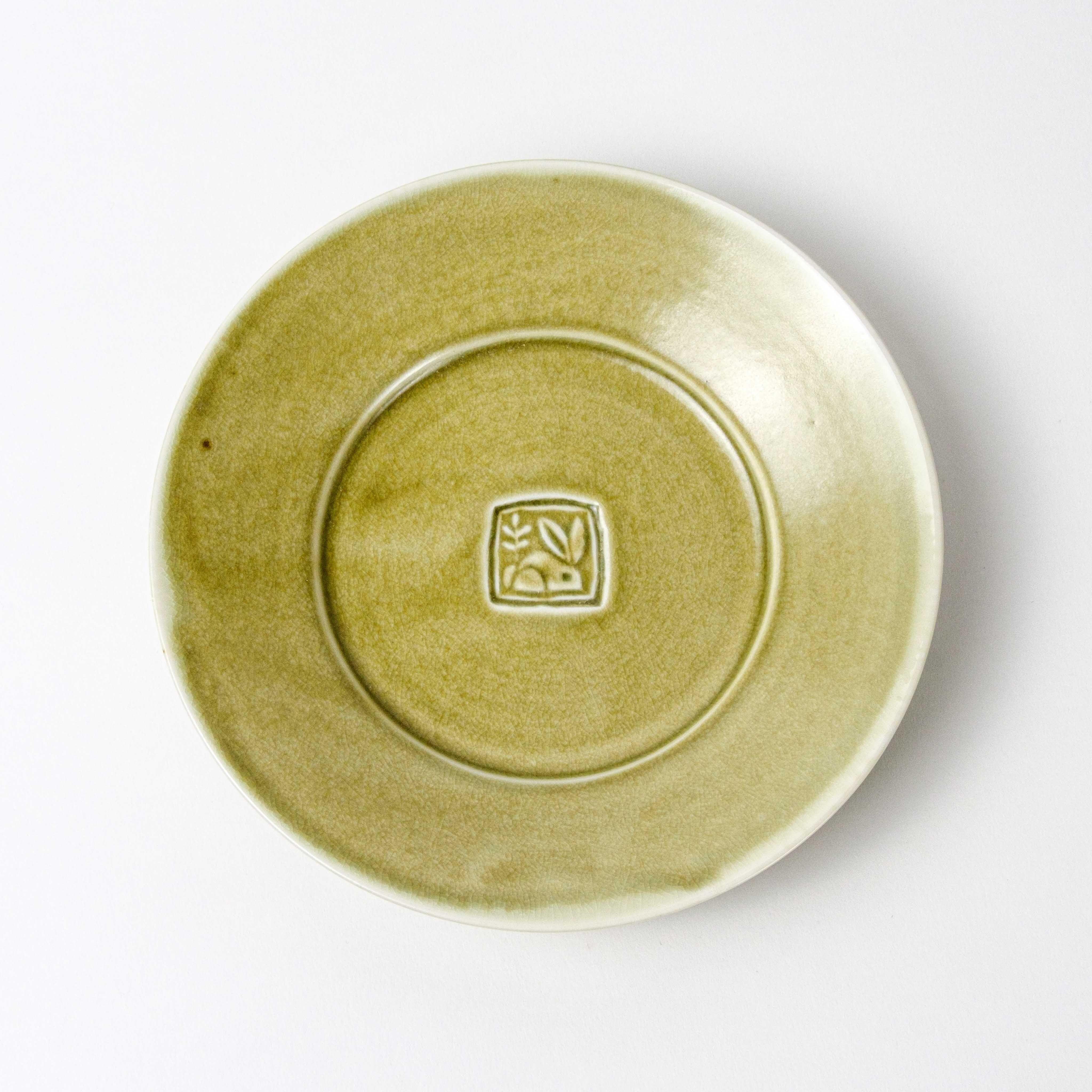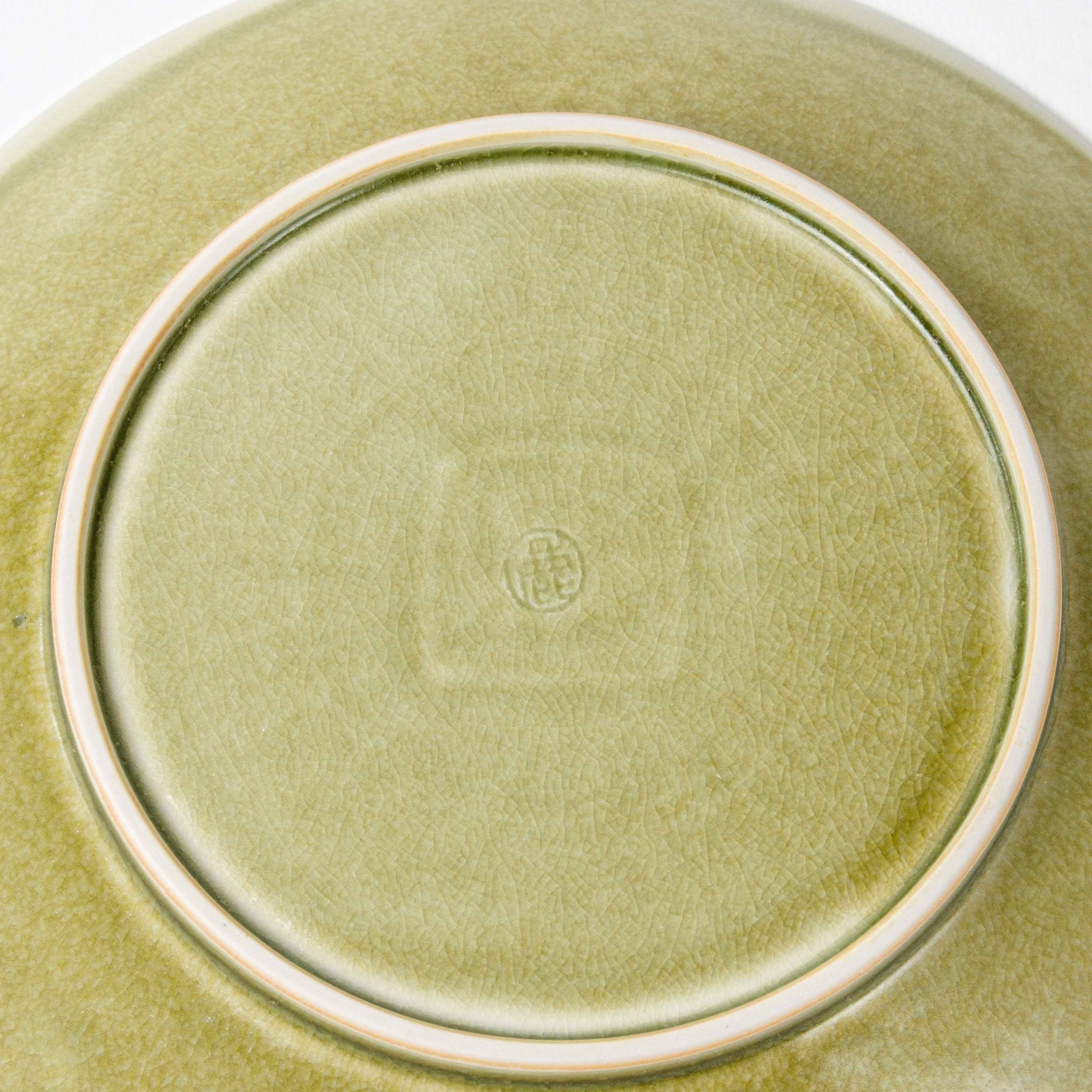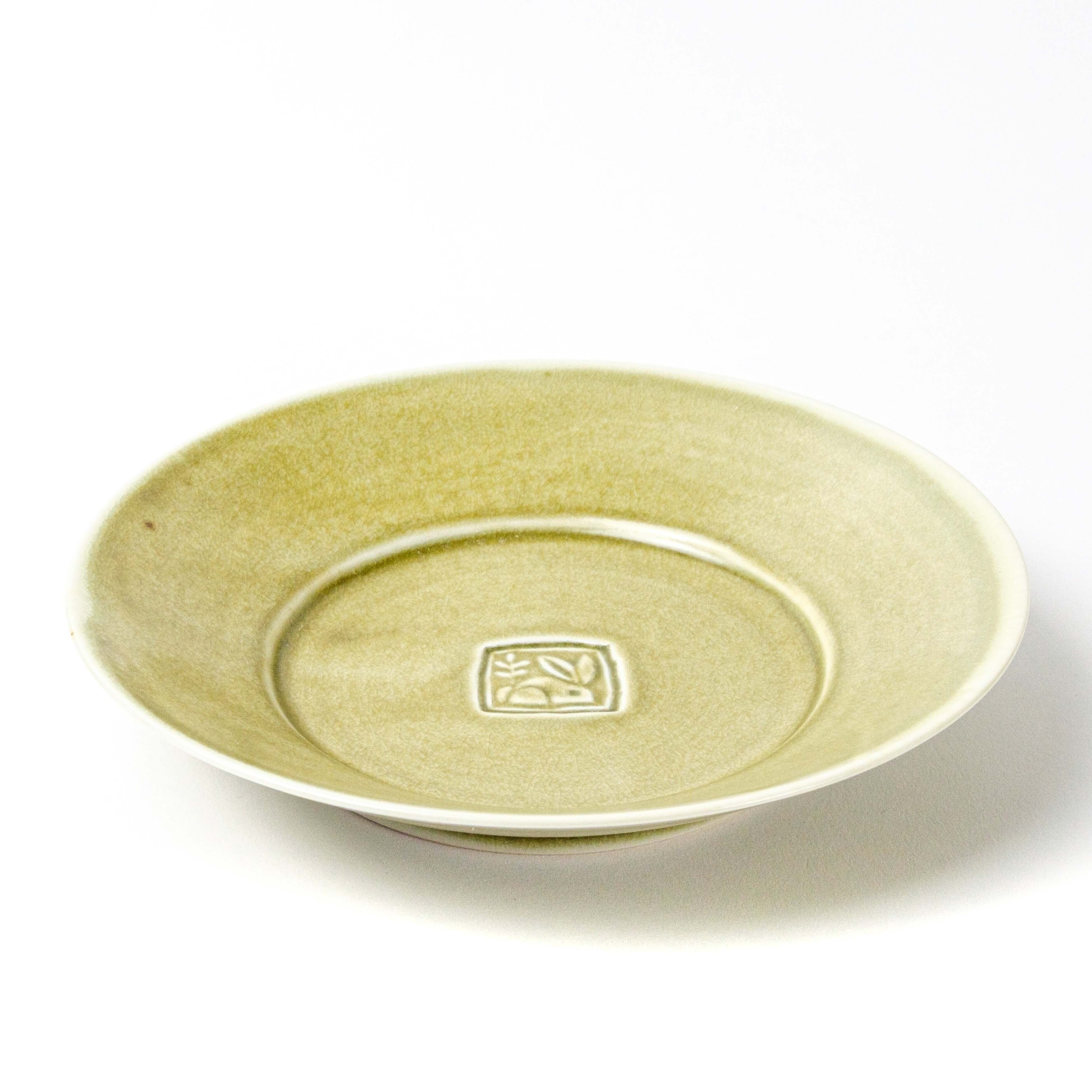 パスタやカレーが盛り付けられるお皿として作りましたが、主菜やフルーツなど様々なものに使い勝手よく、食卓での使用頻度が高い器です。上出が彫ったハンコを見込の中央に刻印しています。