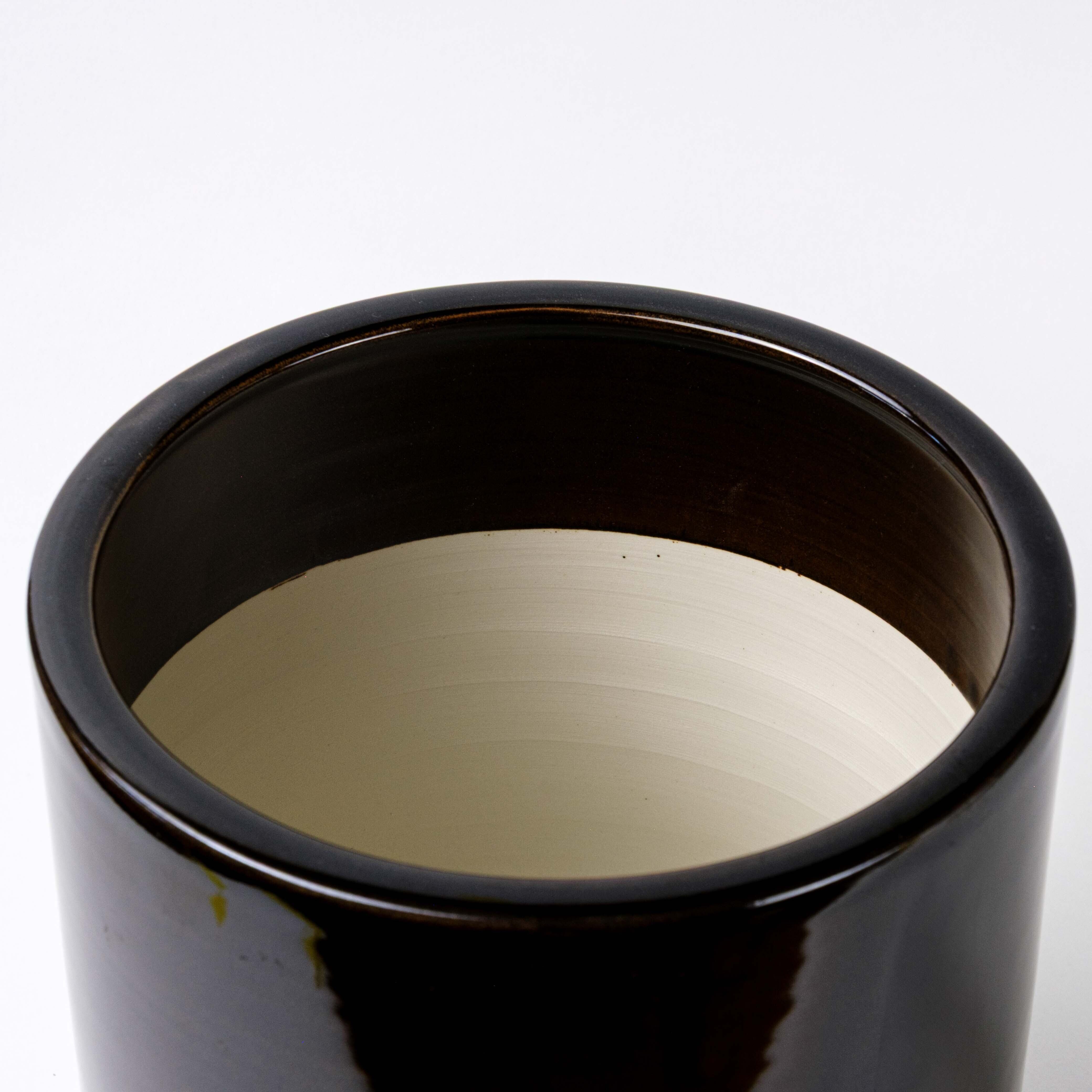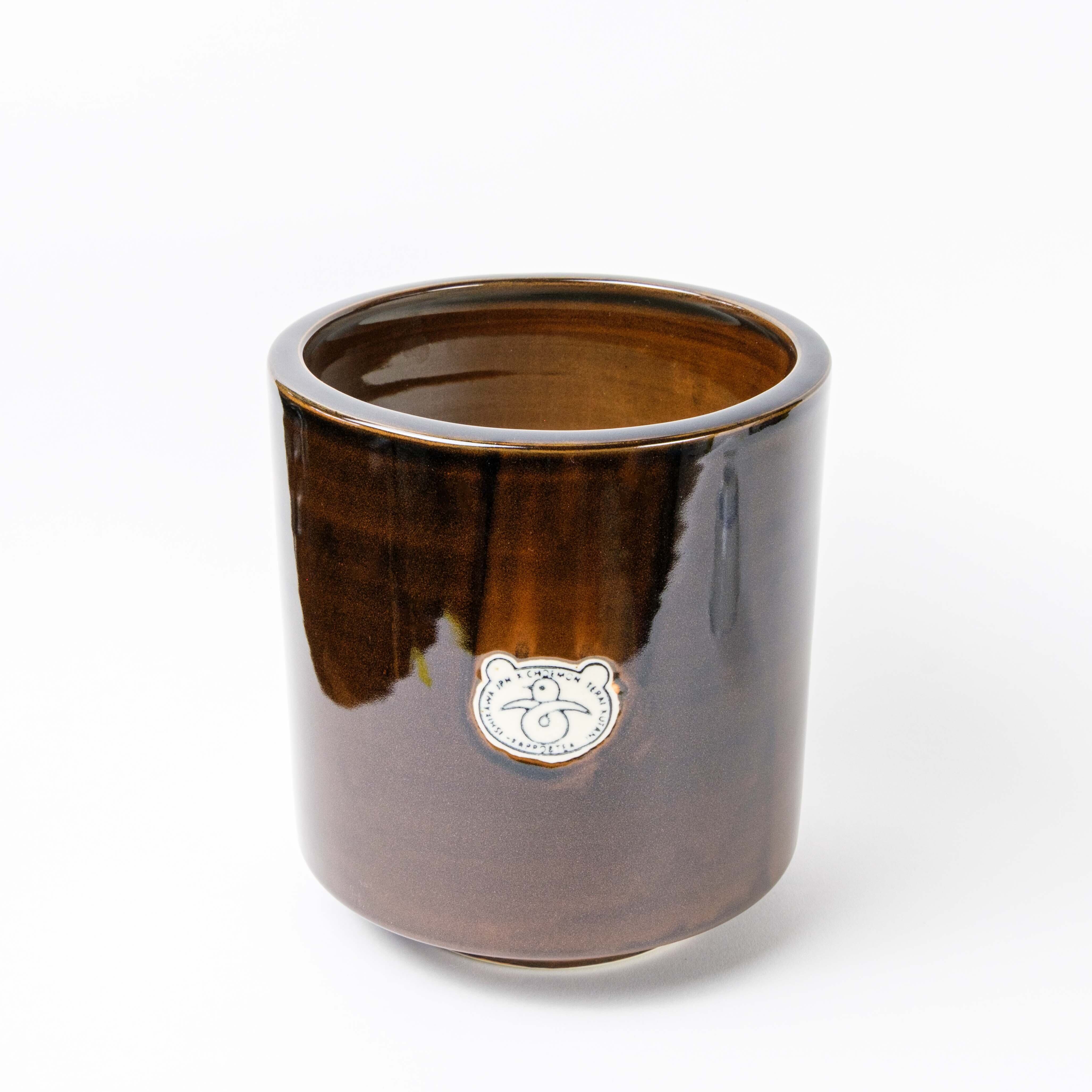 寸胴型の植木鉢です。実は上出長右衛門窯が作っている分銅型一輪挿しを上下逆さまにした形になっています。分銅型と同じ木瓜雁金文をハンコで捺して絵付しています。