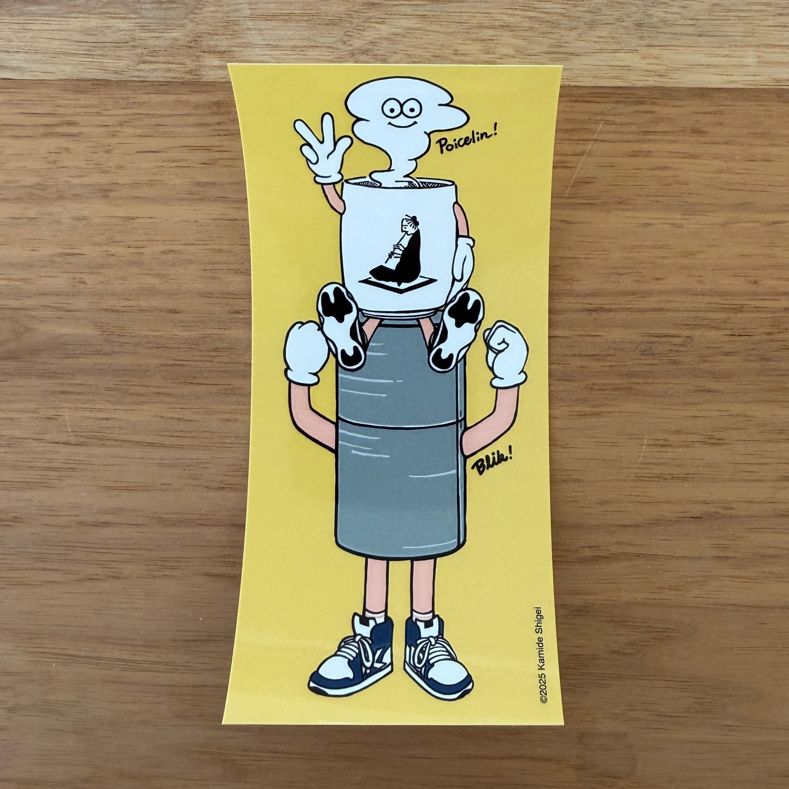茶筒をつくり続ける京都・開化堂150周年を記念して上出瓷藝がデザインを担当したキャラクター「ブリックくん」と、その友人、上出長右衛門窯の創業146周年を記念して誕生したキャラクター「ポワセリンくん」が一緒になったステッカー。蓋を閉めると顔が隠れるブリックくんと、湯気の顔がどこかへすぐに消えてしまうポワセリンくんというジレンマを抱えた2社のキャラクター。