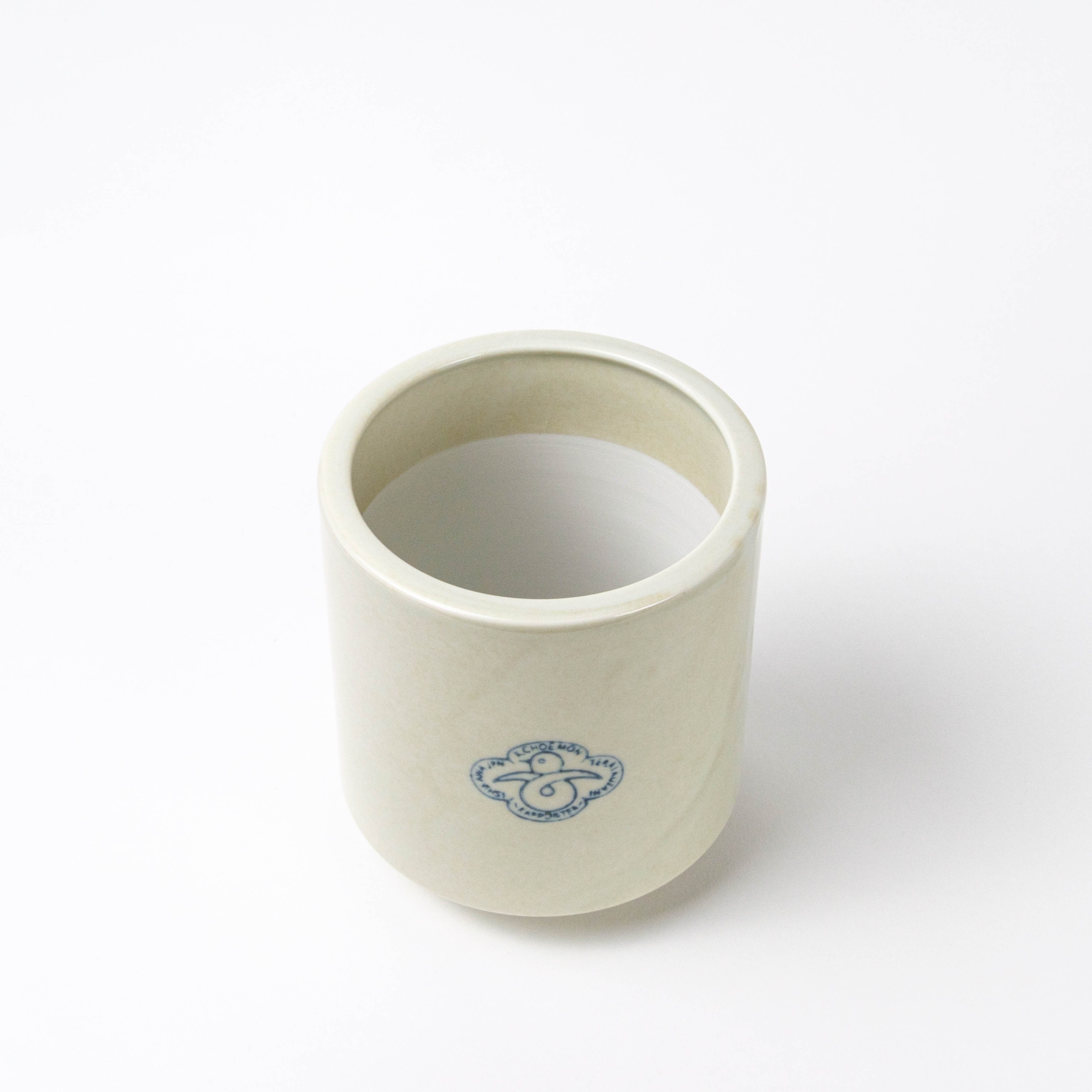 寸胴型の植木鉢です。実は上出長右衛門窯が作っている分銅型一輪挿しを上下逆さまにした形になっています。分銅型と同じ木瓜雁金文をハンコで捺して絵付しています。