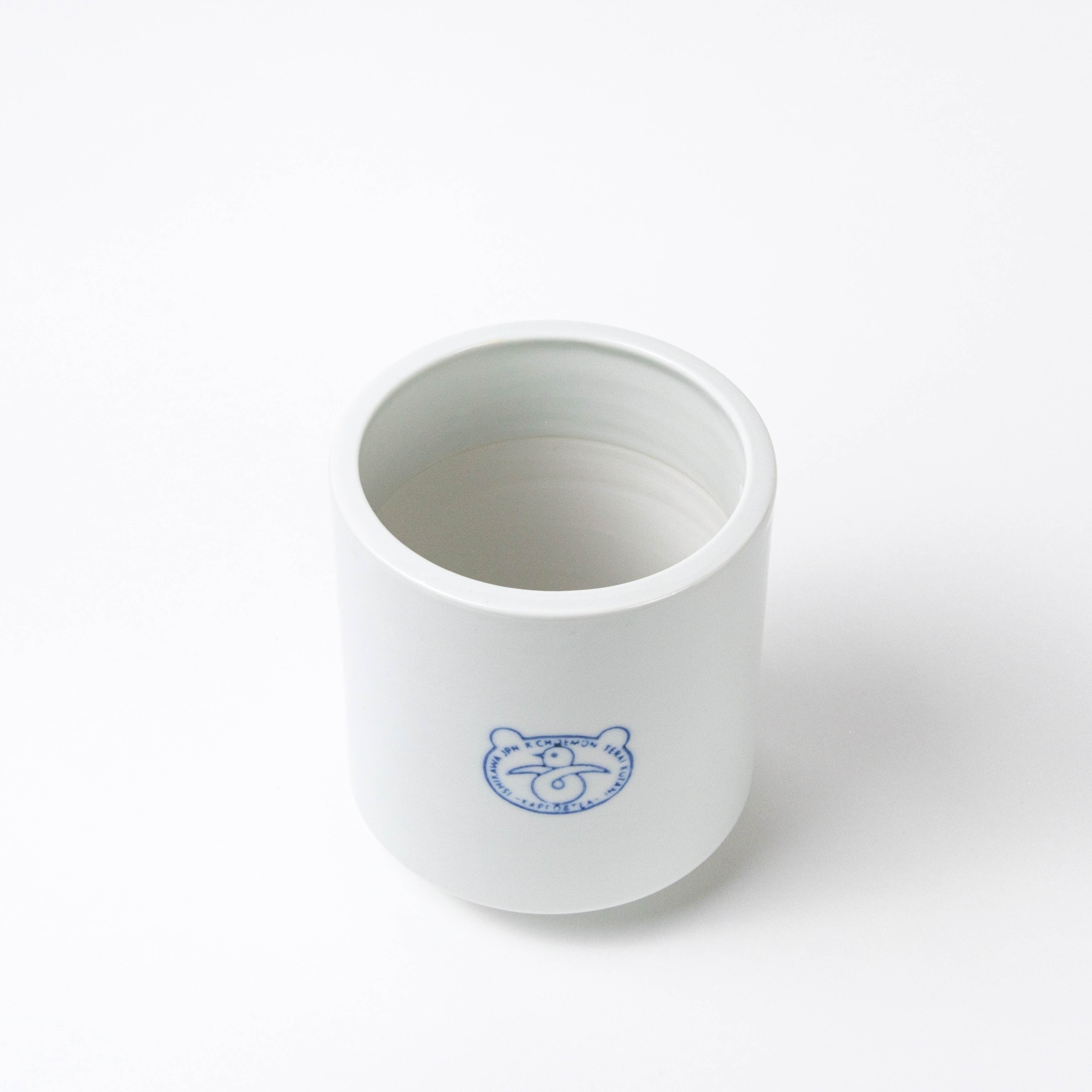 寸胴型の植木鉢です。実は上出長右衛門窯が作っている分銅型一輪挿しを上下逆さまにした形になっています。分銅型と同じ木瓜雁金文をハンコで捺して絵付しています。