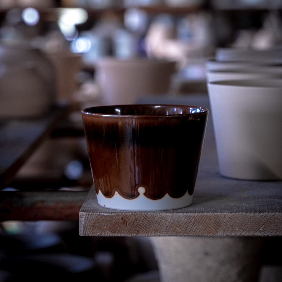 磁器の生産をする上で厄介な存在である鉄を、あえてたくさん添加した釉薬を制作しました。天目とは、鎌倉時代の禅僧が中国の天目山から持ち帰った茶盤に黒い釉薬が施されてあったことがその由来とされています。一般には黒~褐色の鉄釉を天目釉と呼んでいます。