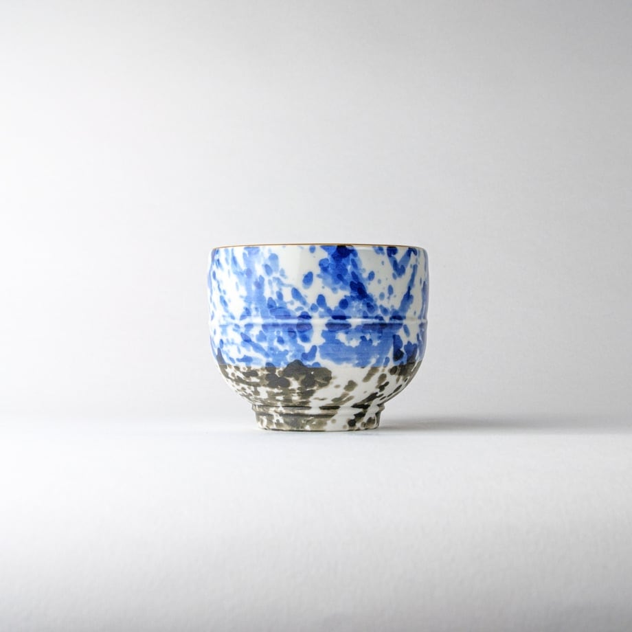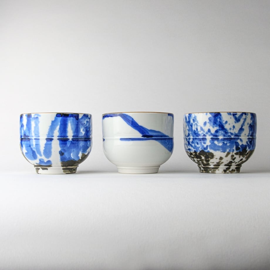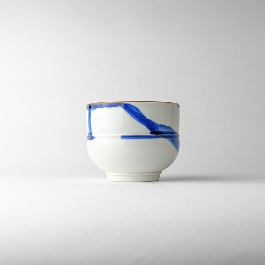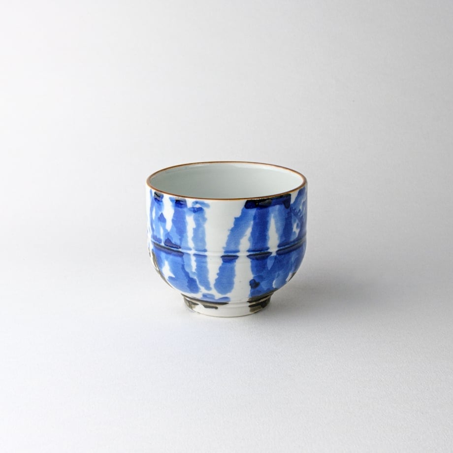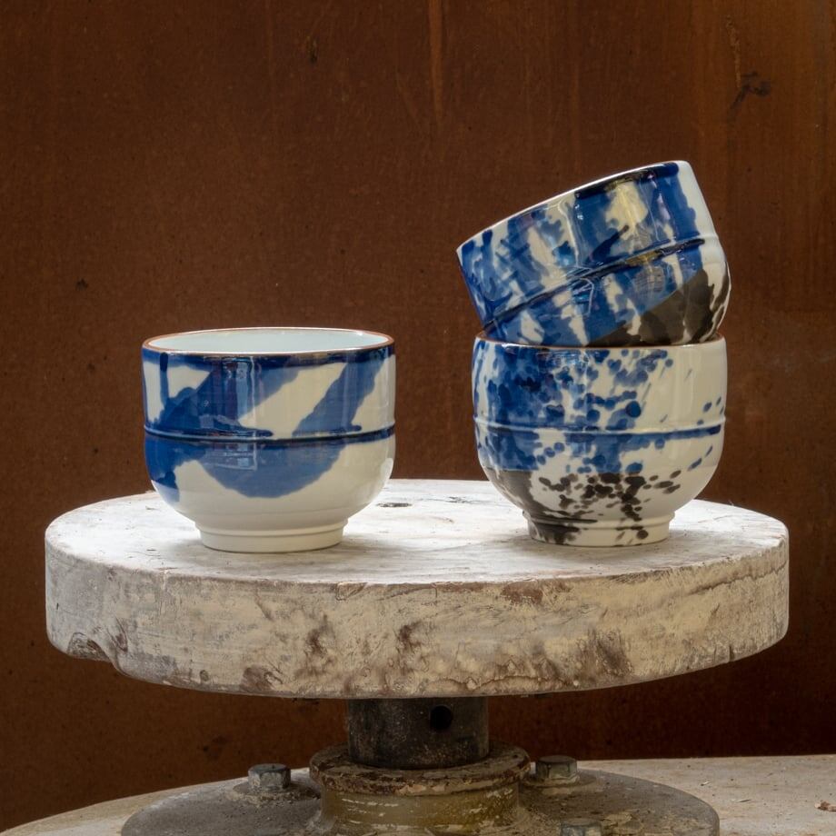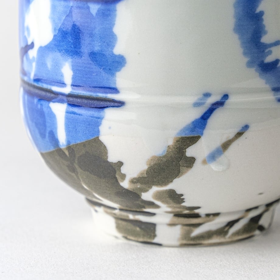 長右衛門窯の染付は釉薬の下でのみ青く発色する性質があることを利用して、染付と釉薬をそれぞれ別々に杓(しゃく)で流すように掛けて、青く発色する部分としない部分を風景として楽しめるようにしました。