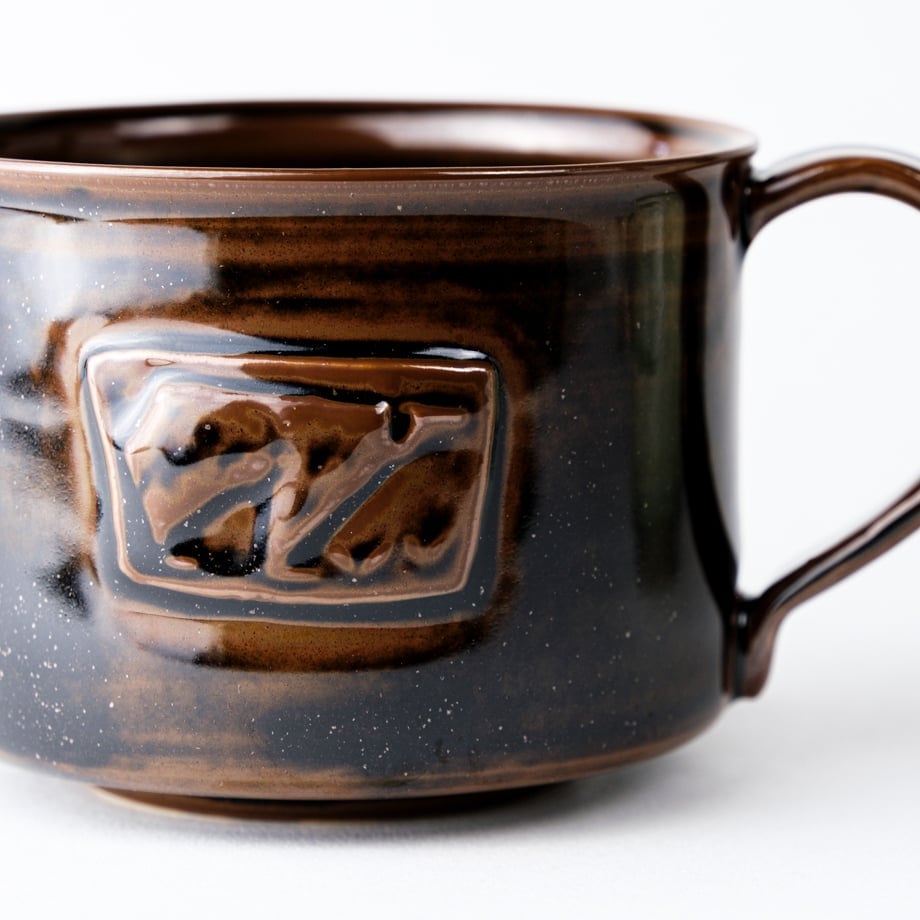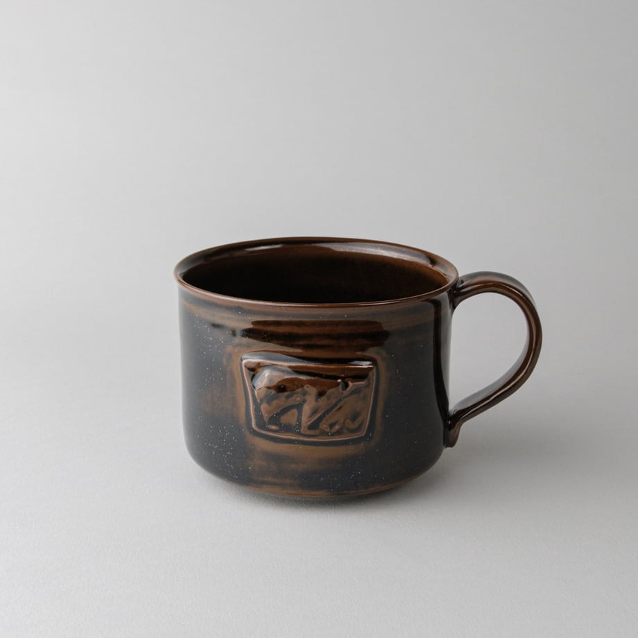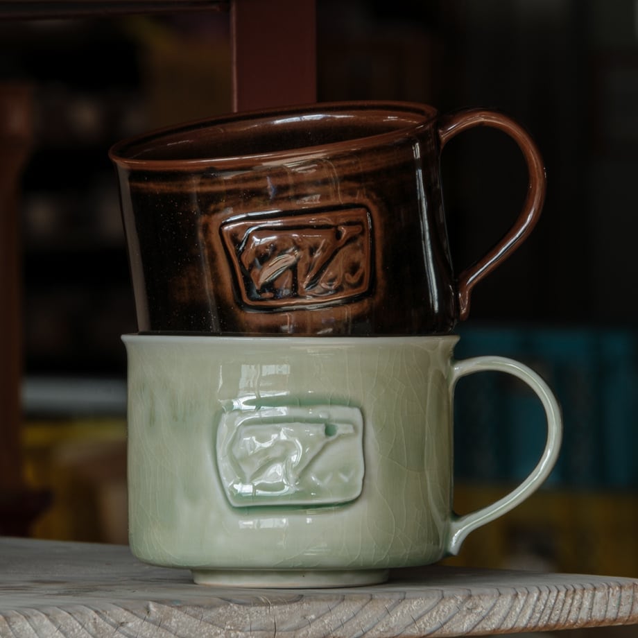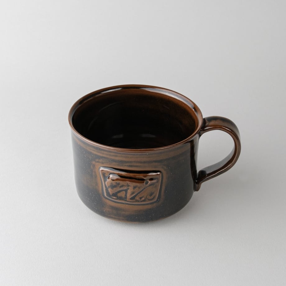 六代目上出惠悟が彫ったスタンプで作った浮彫りのワッペンを貼り付けた筒形のマグカップ。口作りも飲みやすく工夫されていています。さまざまなお飲み物に、また贈り物にもどうぞ。