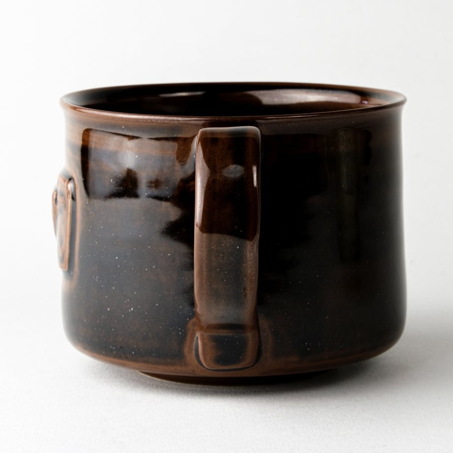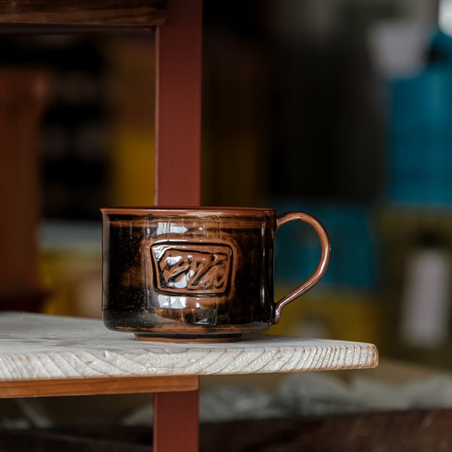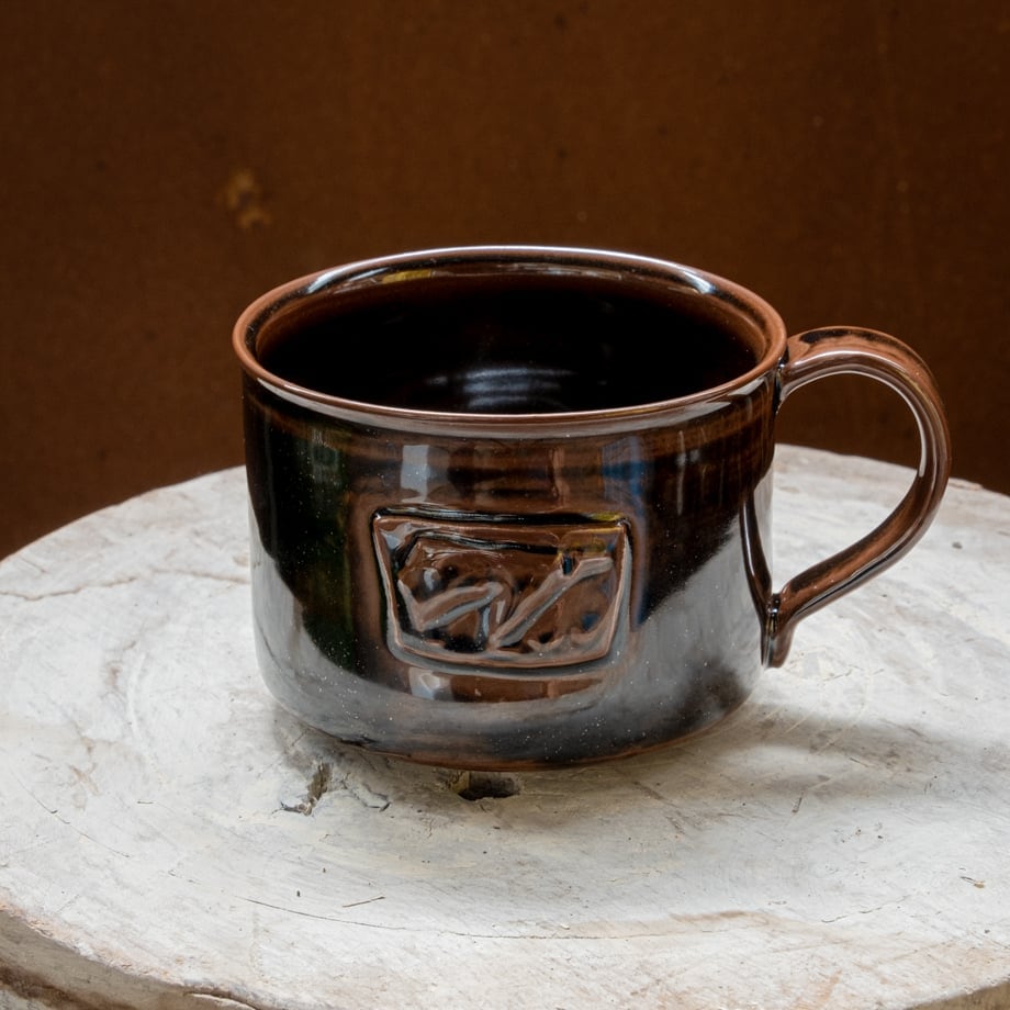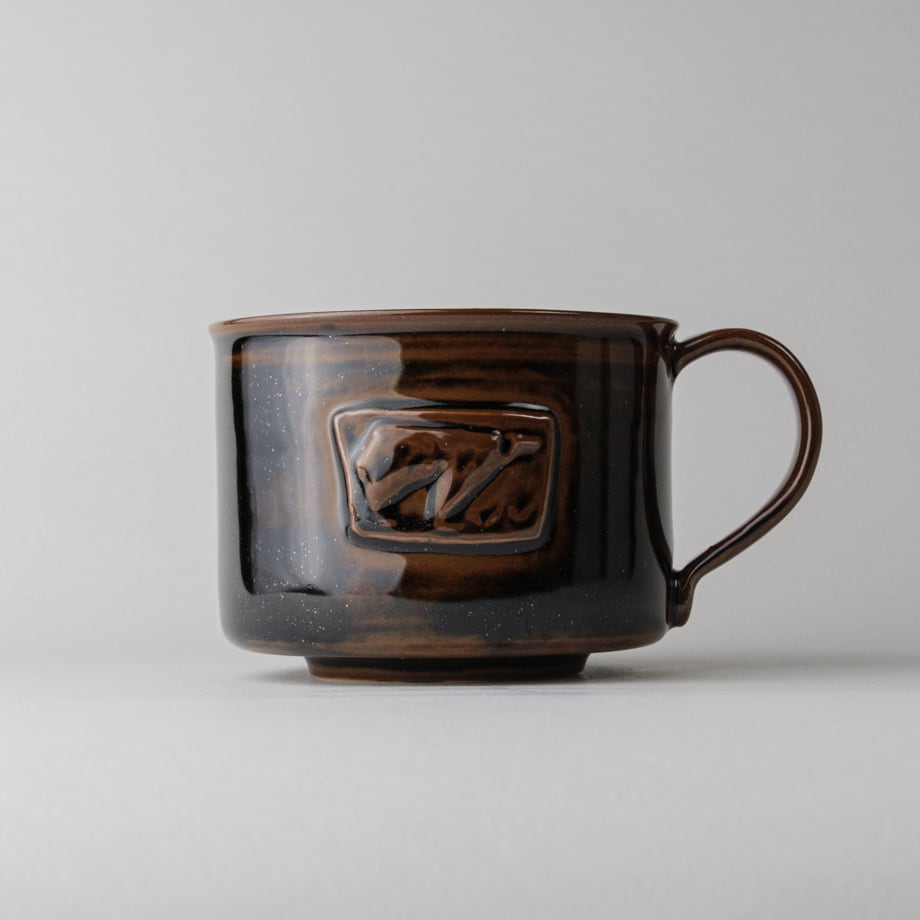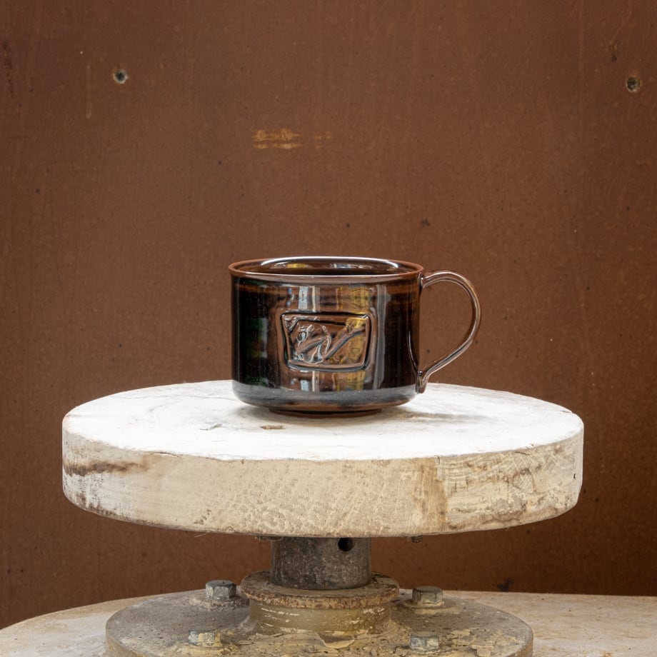 六代目上出惠悟が彫ったスタンプで作った浮彫りのワッペンを貼り付けた筒形のマグカップ。口作りも飲みやすく工夫されていています。さまざまなお飲み物に、また贈り物にもどうぞ。