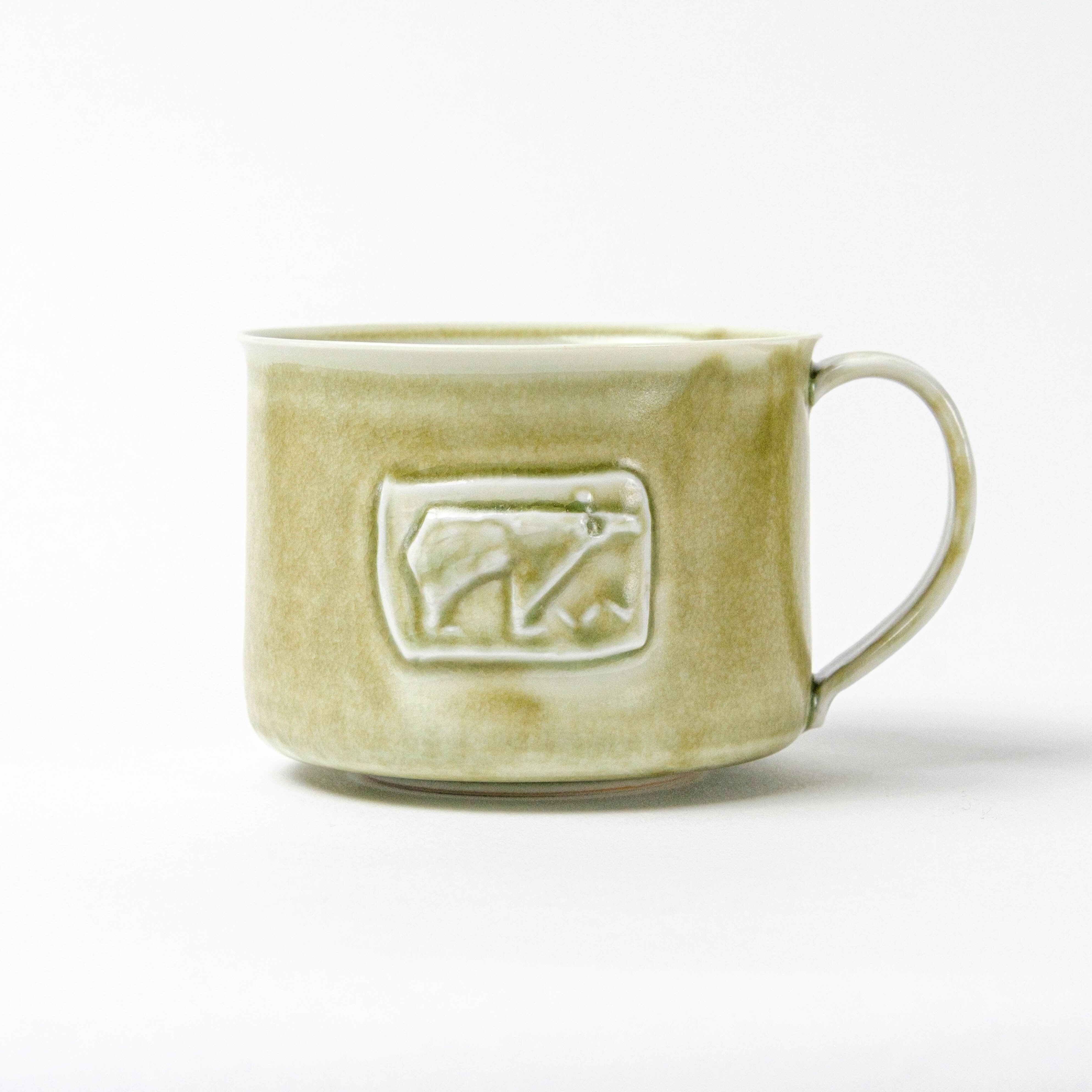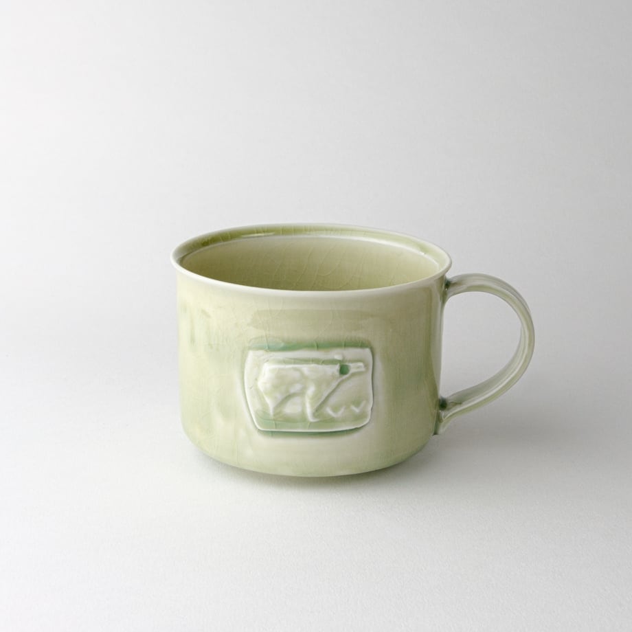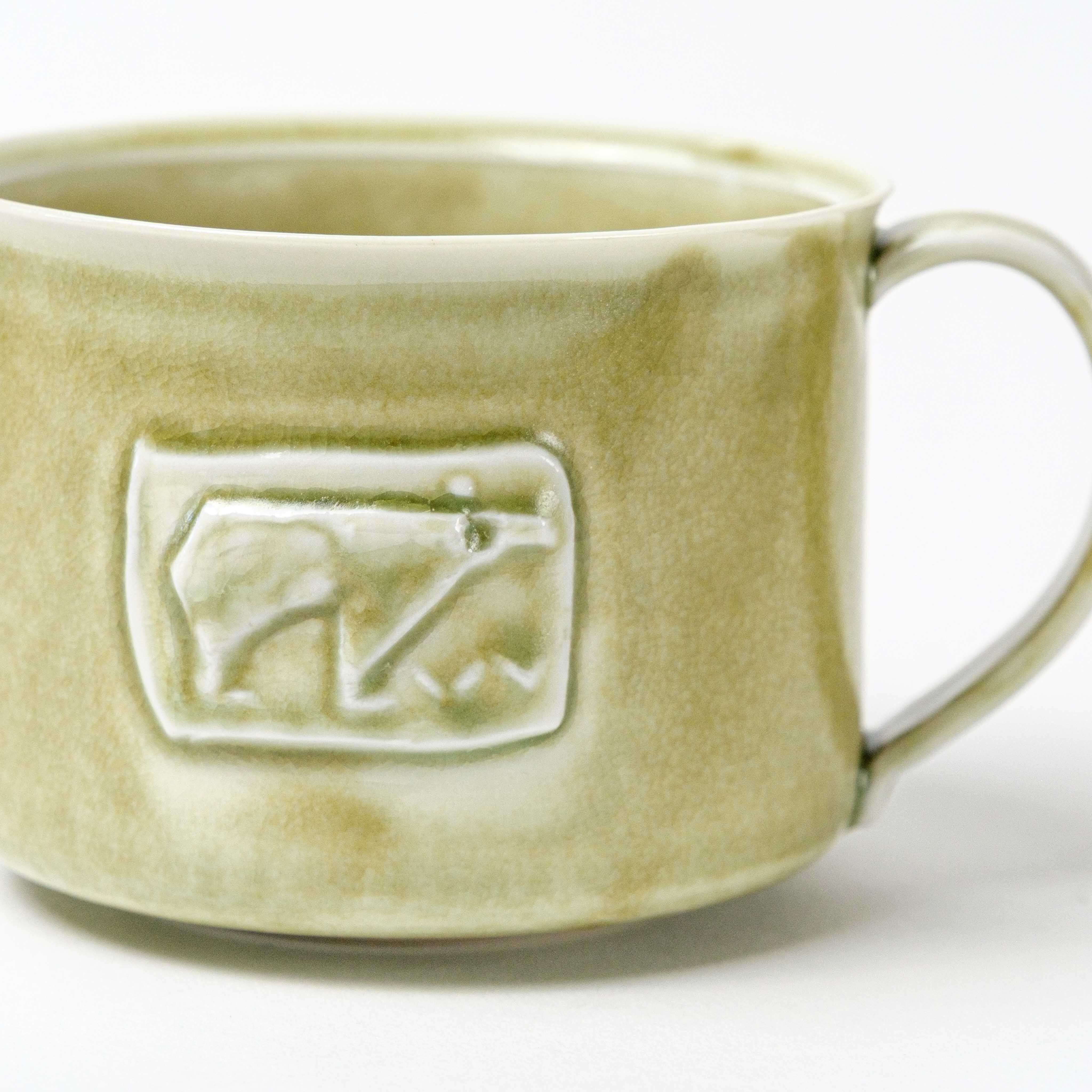 六代目上出惠悟が彫ったスタンプで作った浮彫りのワッペンを貼り付けた筒形のマグカップ。口作りも飲みやすく工夫されていています。さまざまなお飲み物に、また贈り物にもどうぞ。