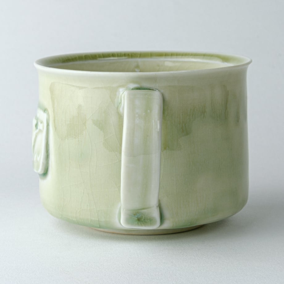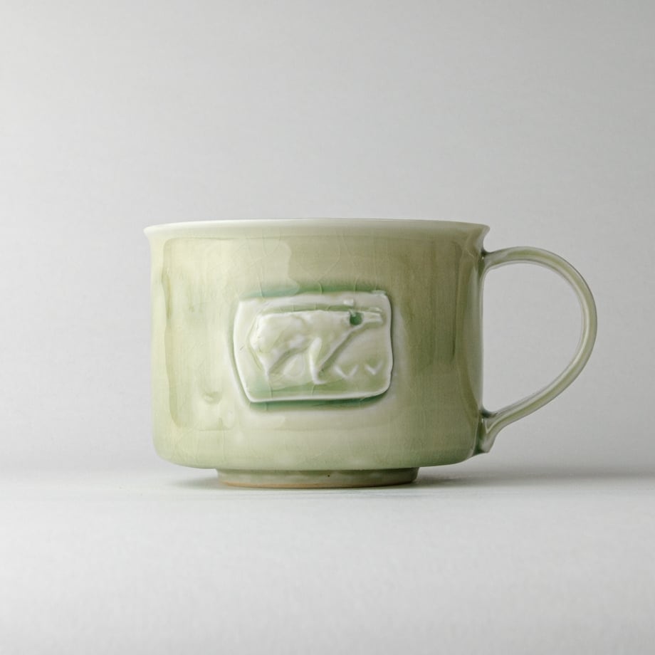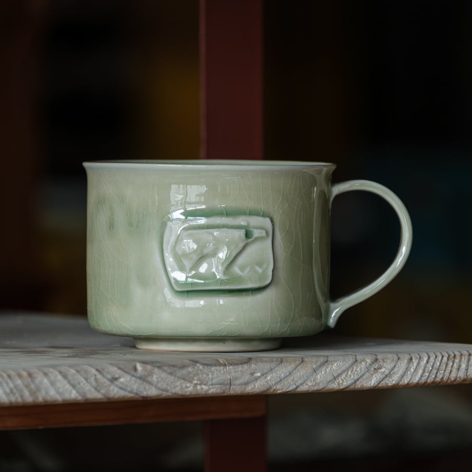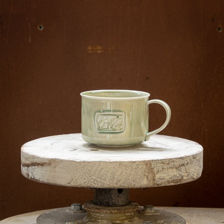 六代目上出惠悟が彫ったスタンプで作った浮彫りのワッペンを貼り付けた筒形のマグカップ。口作りも飲みやすく工夫されていています。さまざまなお飲み物に、また贈り物にもどうぞ。