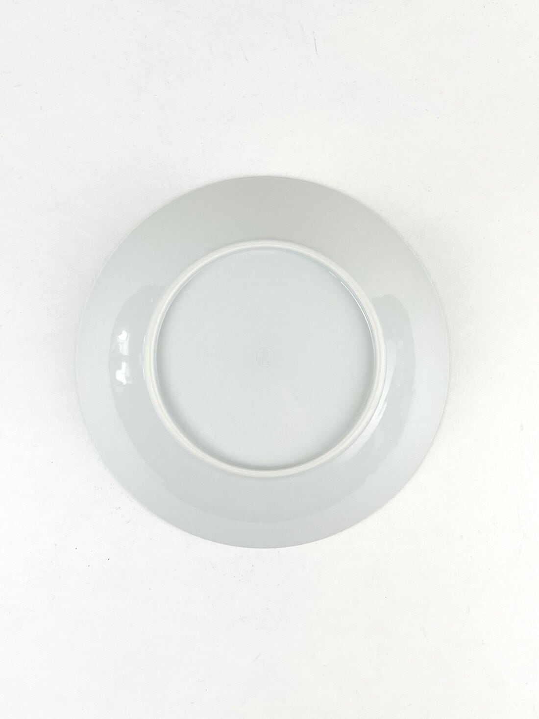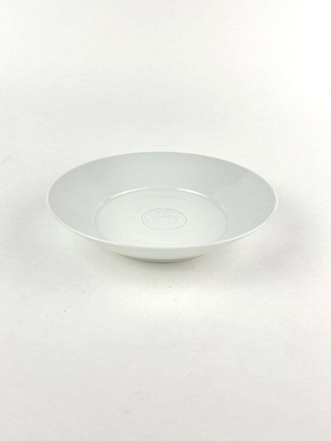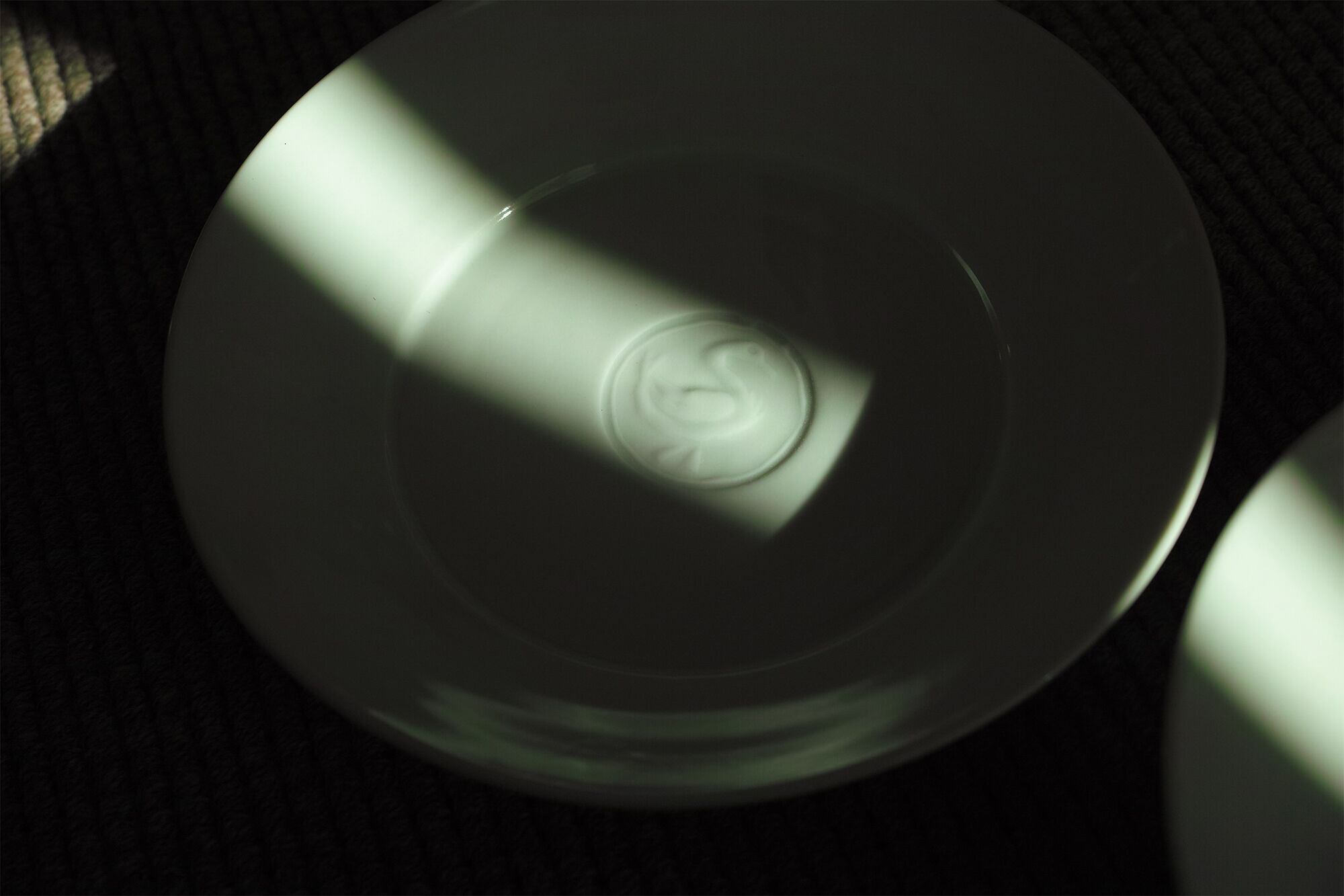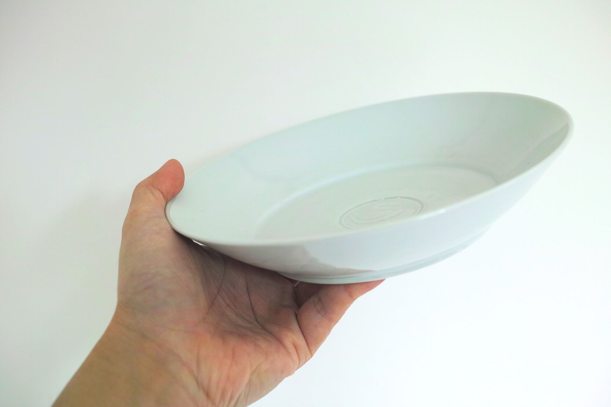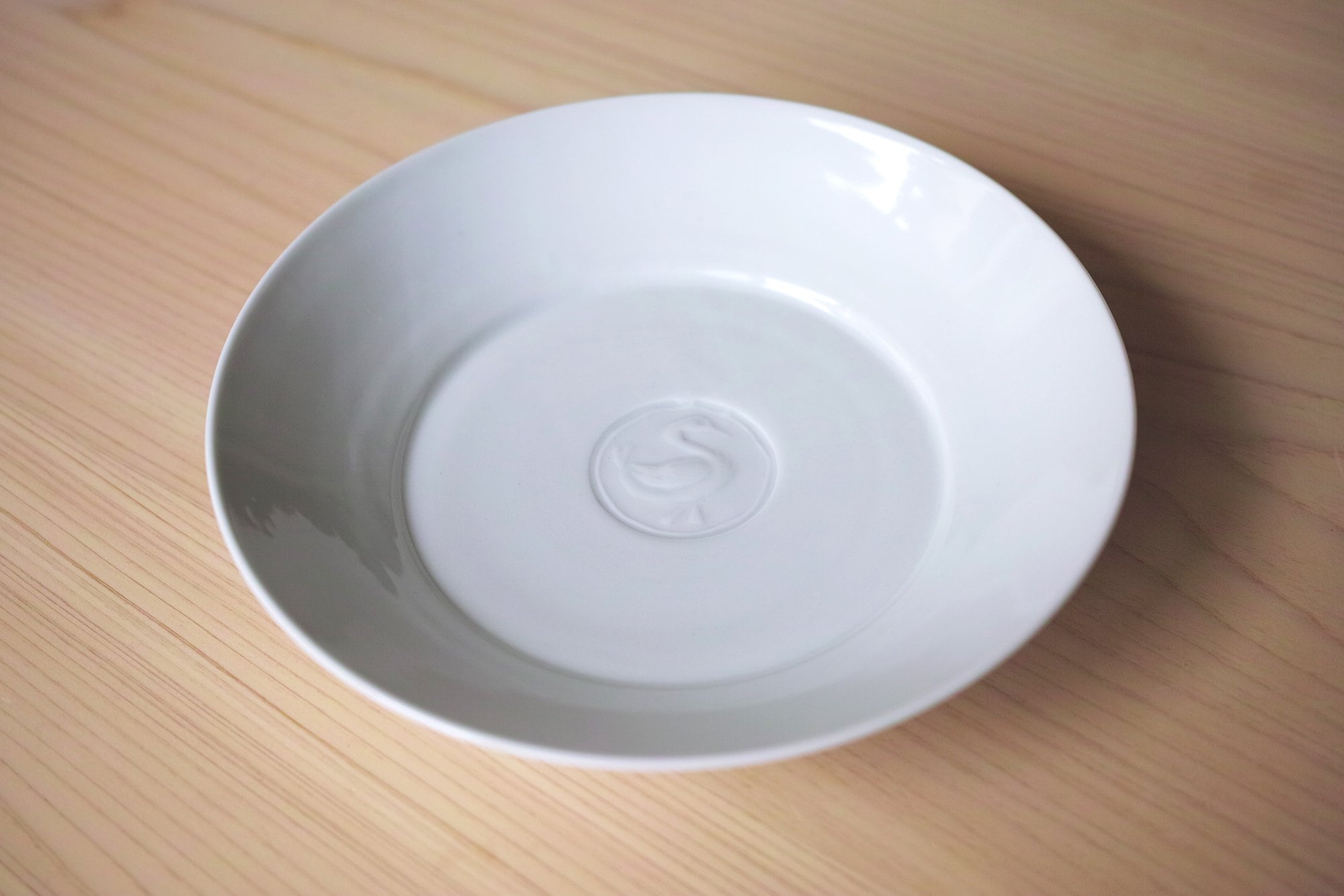 パスタやカレーが盛り付けられるお皿として作りましたが、主菜やフルーツなど様々なものに使い勝手よく、食卓での使用頻度が高い器です。上出が彫ったハンコを見込の中央に刻印しています。
