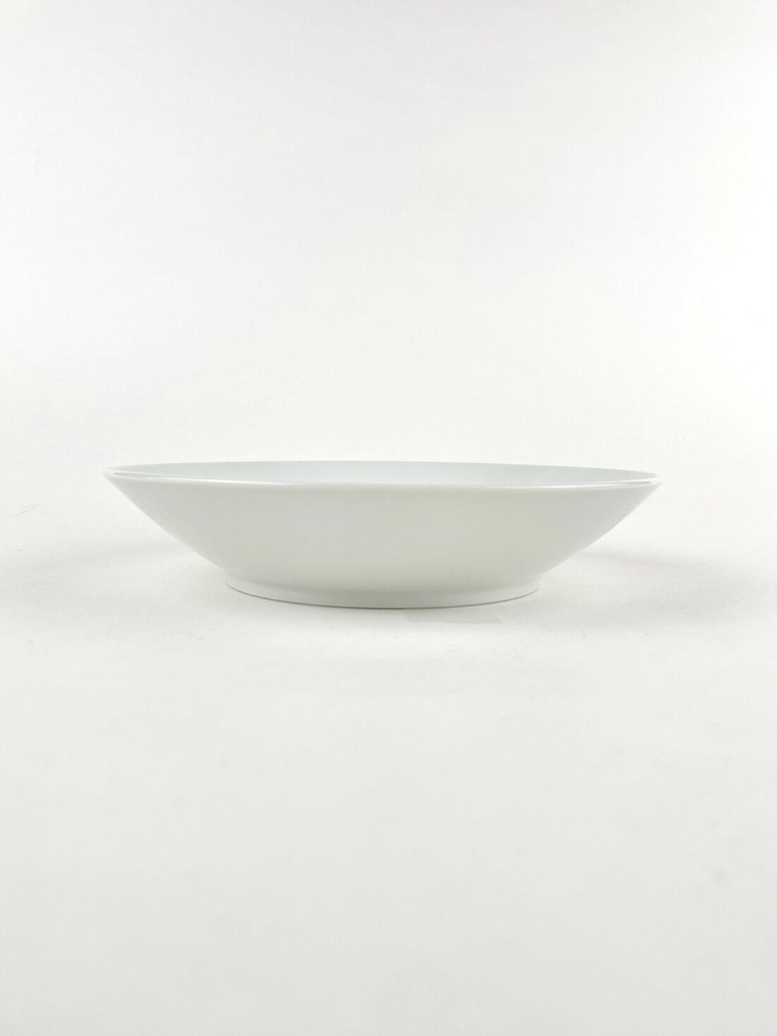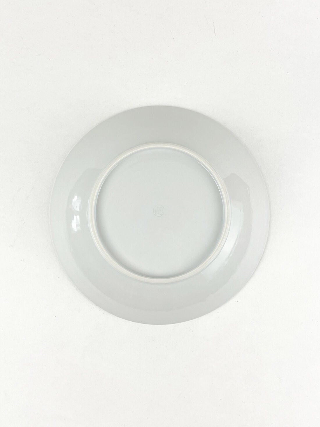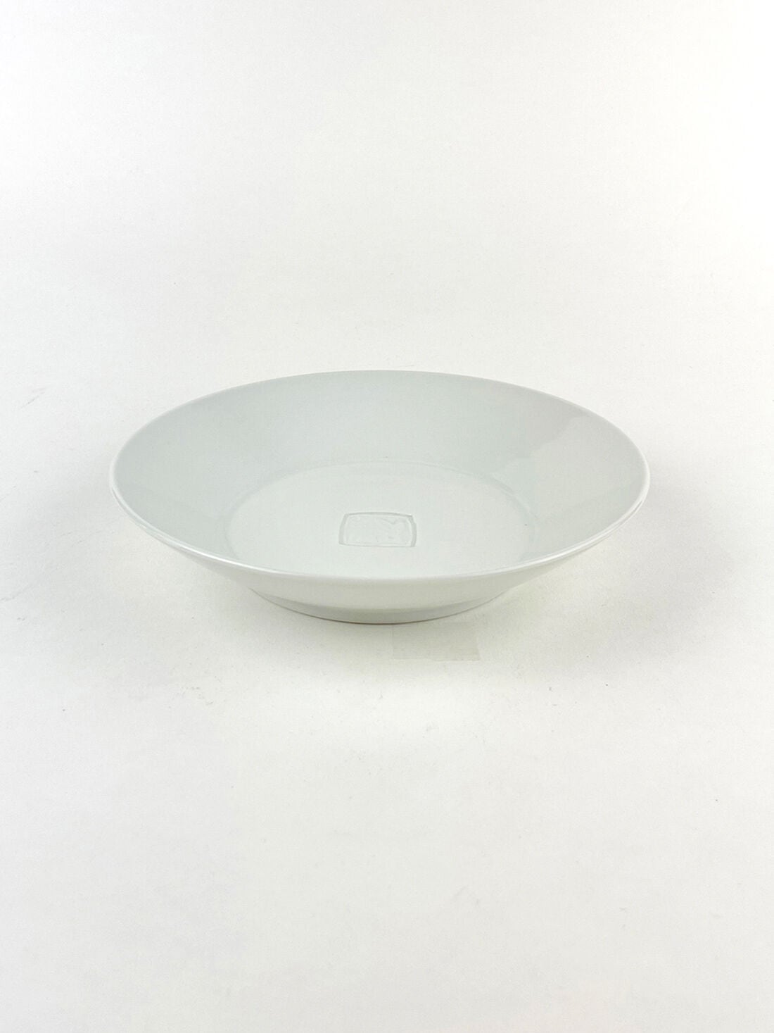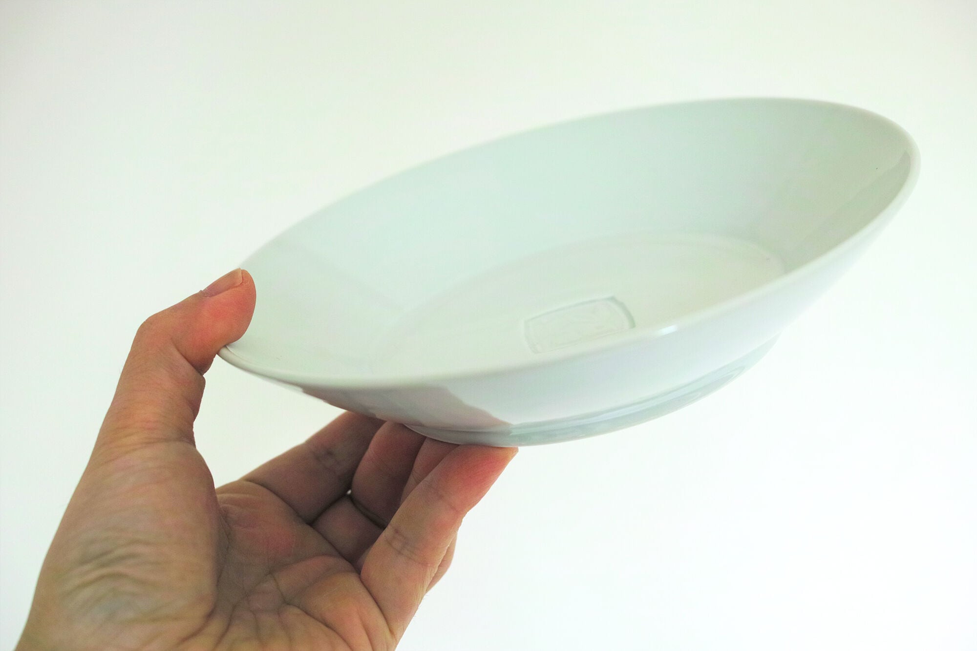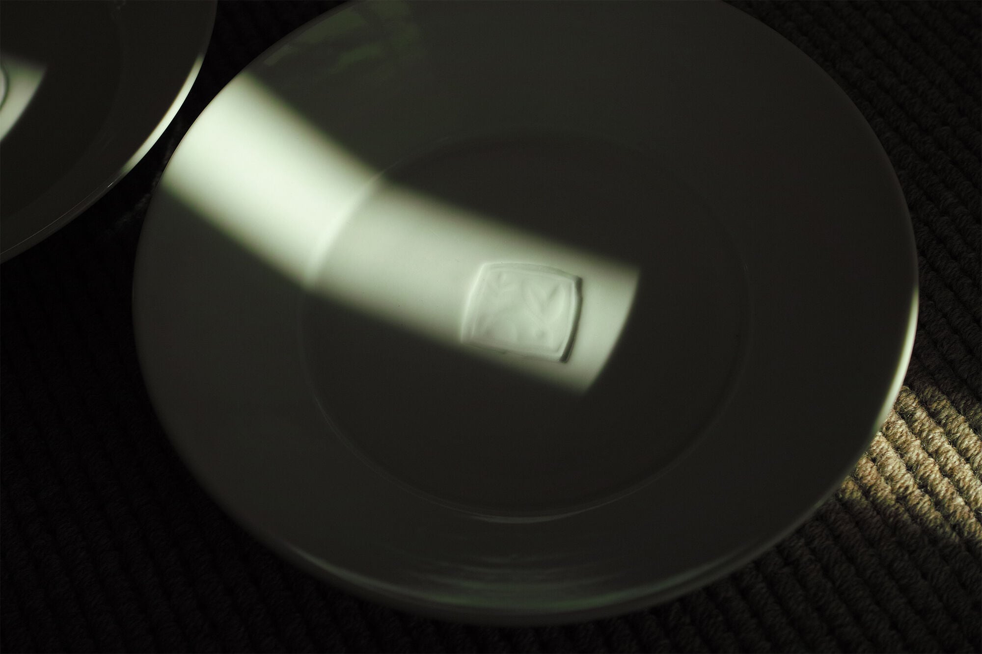 パスタやカレーが盛り付けられるお皿として作りましたが、主菜やフルーツなど様々なものに使い勝手よく、食卓での使用頻度が高い器です。上出が彫ったハンコを見込の中央に刻印しています。