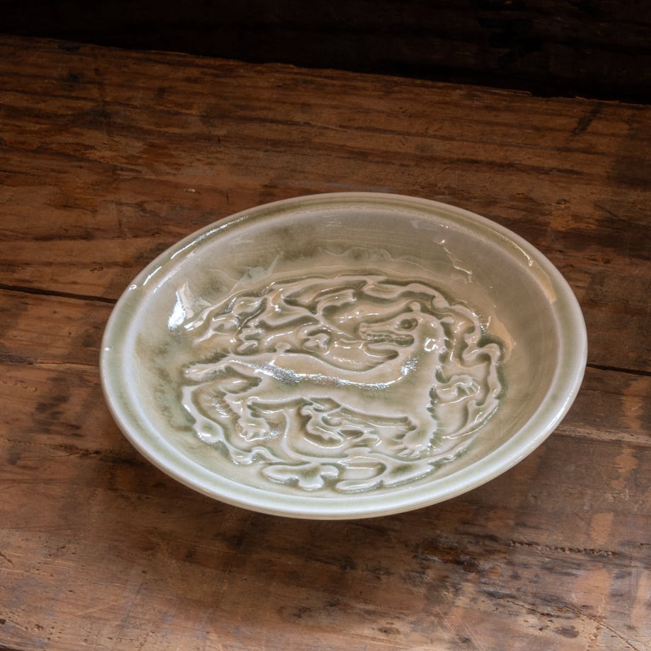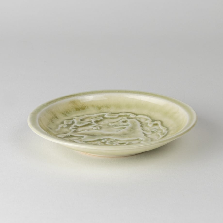 これまでも様々な商品に施して来た日本の古い熊の図像である蛮絵の熊を、型打皿にしました。作り方は「型打(かたうち)」といい、轆轤で作った柔らかい粘土の器を型に押し当てて作っています。型打技法は比較的薄くて軽い器を作れる事が特徴です。副菜やおやつ、お菓子や果物にも最適です。
