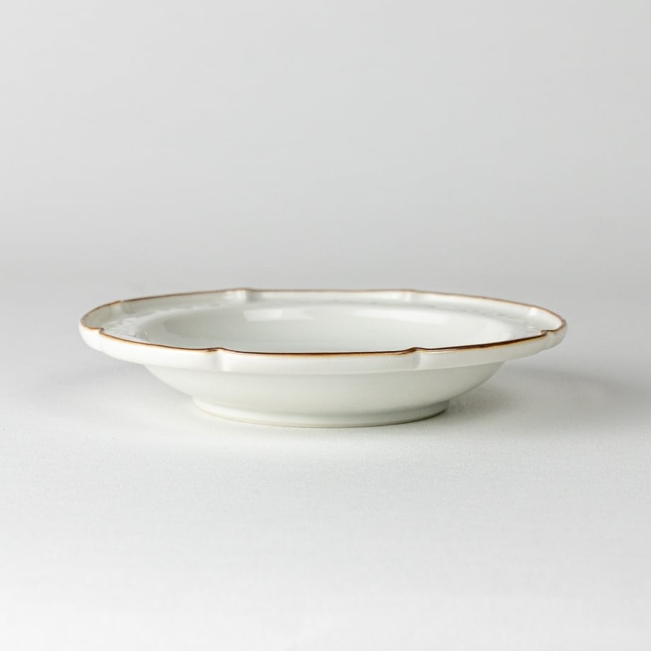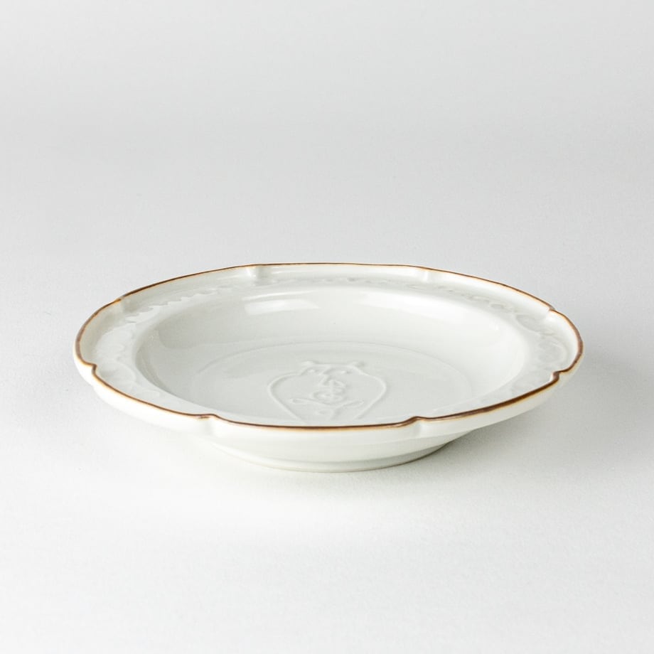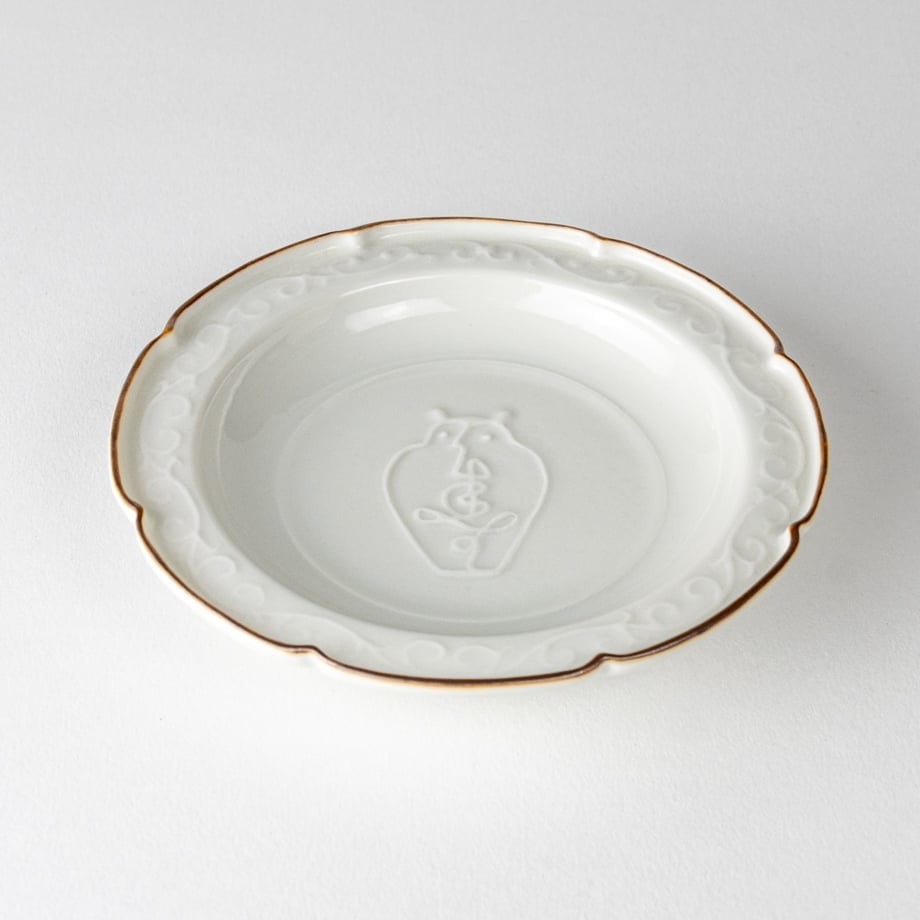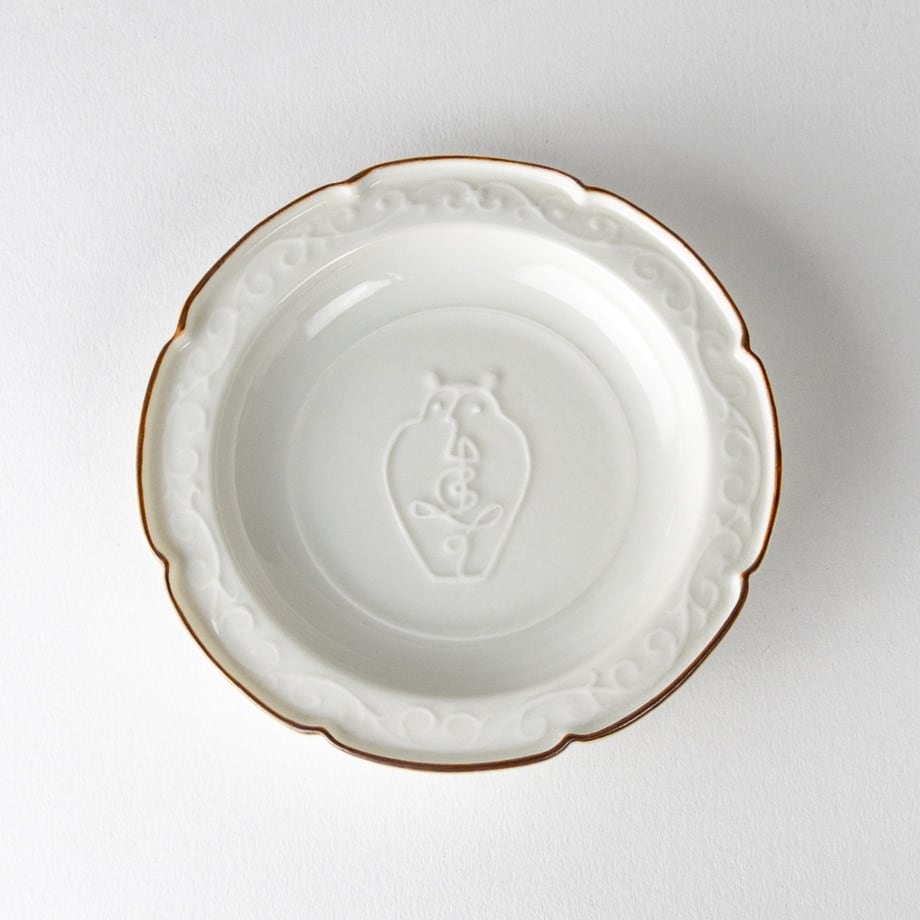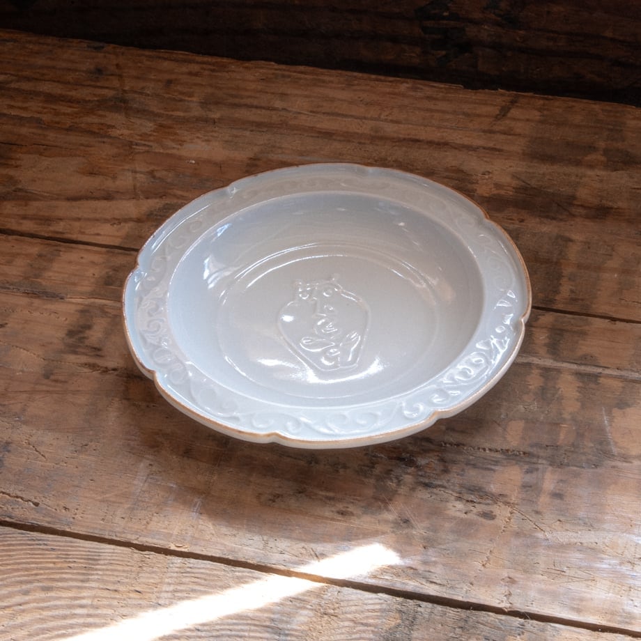 長右衛門窯六代目上出惠悟の生み出したキャラクターである寿福老の浮彫りがかわいい四寸皿。作り方は「型打(かたうち)」といい、轆轤で作った柔らかい状態の粘土の器を型に押し当てて作っています。型打技法は比較的薄くて軽い器を作れる事が特徴です。副菜やおやつ、お菓子や果物にも最適です。