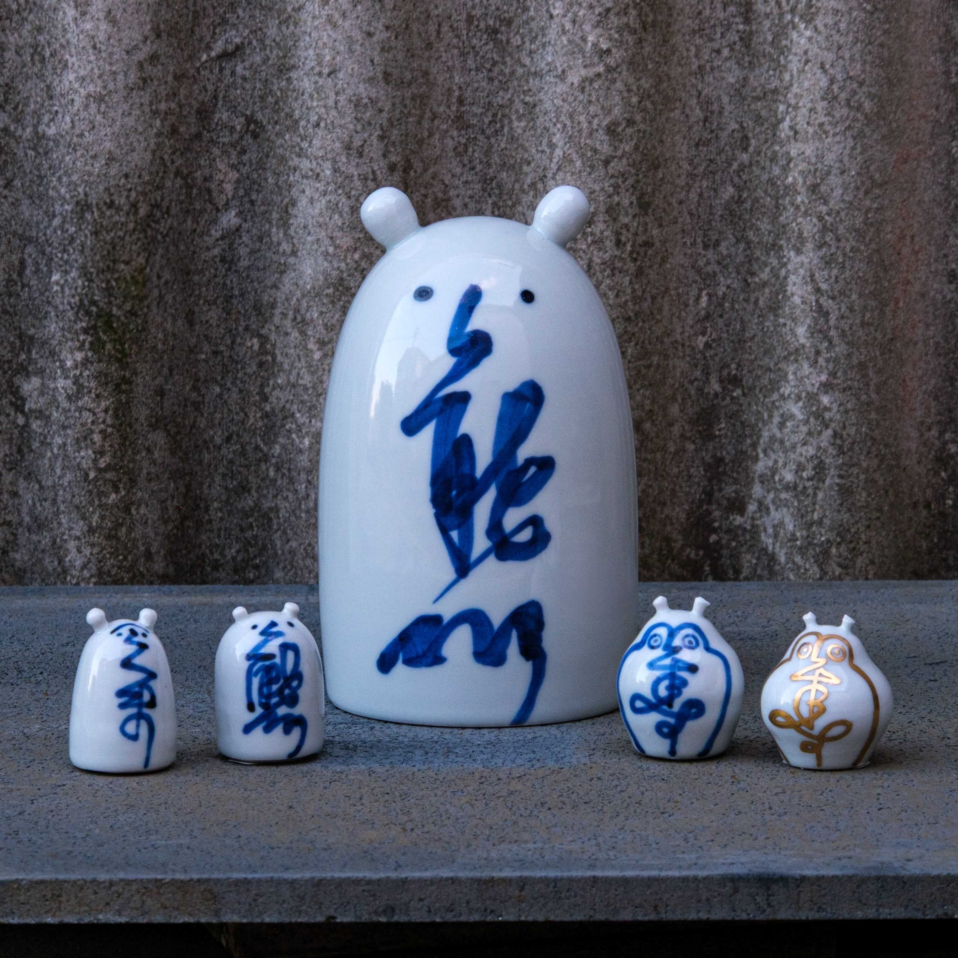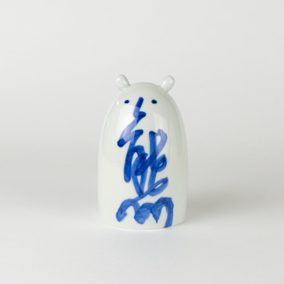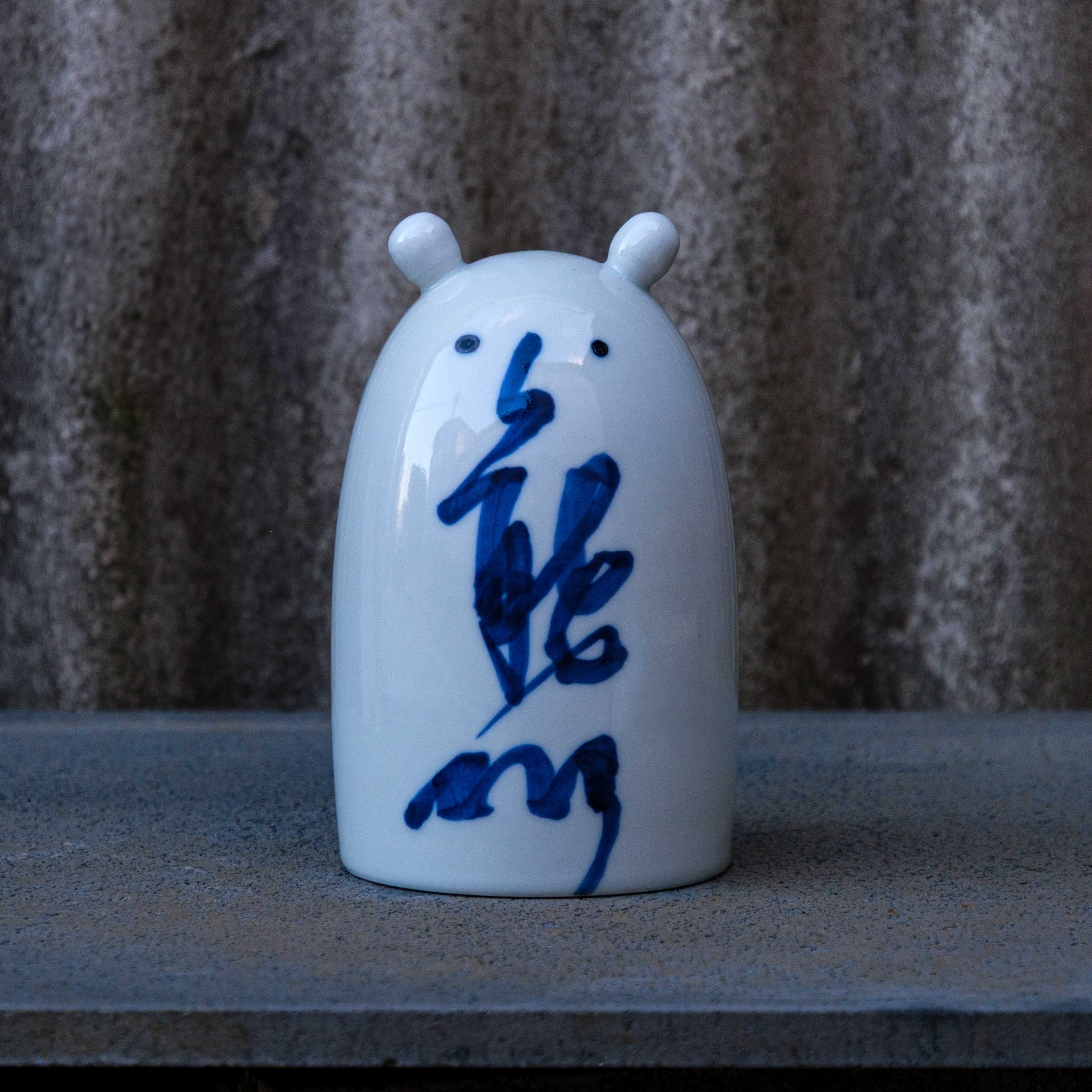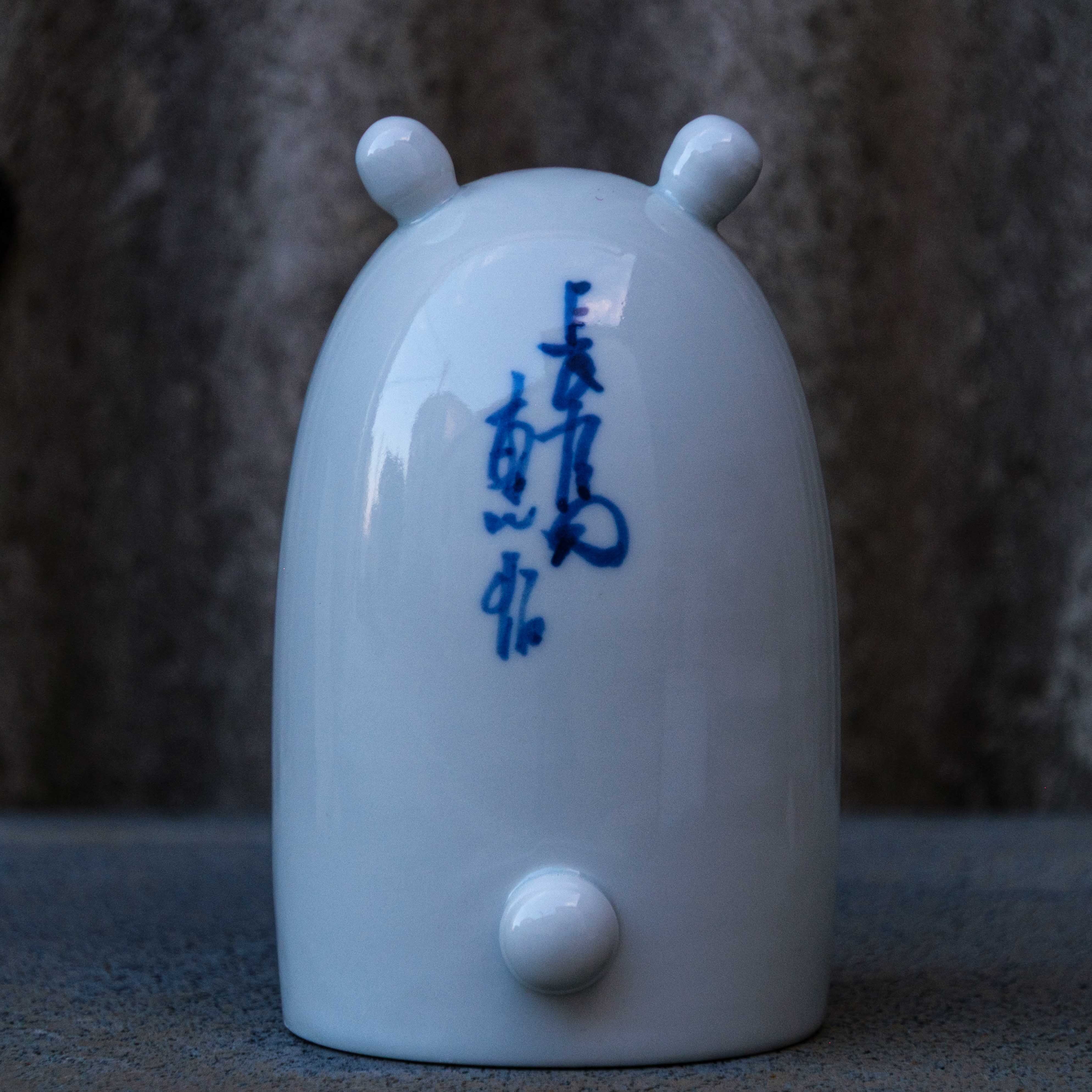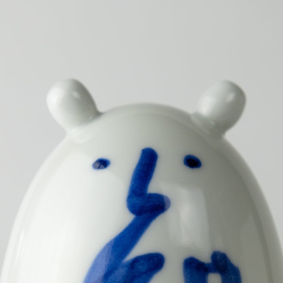 轆轤でつくった熊の置物です。六代目の上出惠悟が漢字で「熊」と書いています。「寿」と「フクロウ」をミックスした「寿福老」にちなみ、「熊福老」と名付けました。