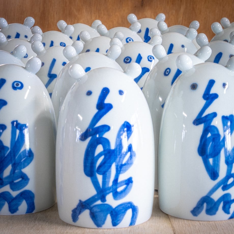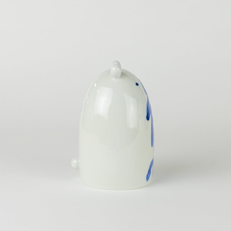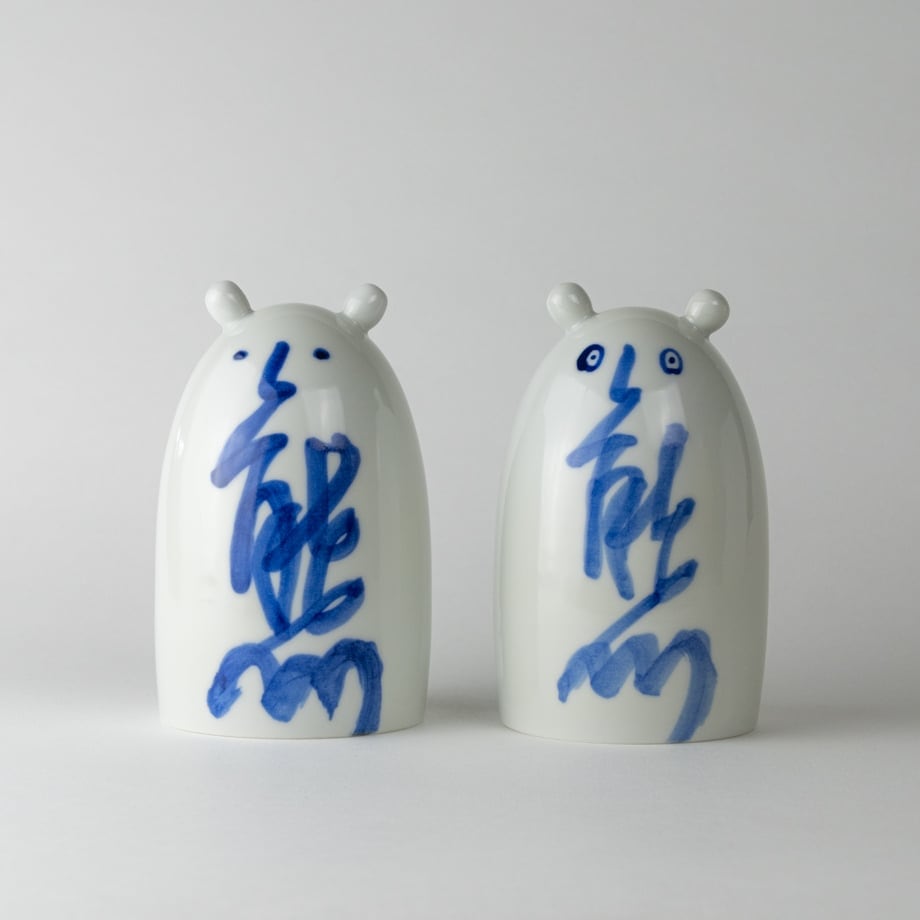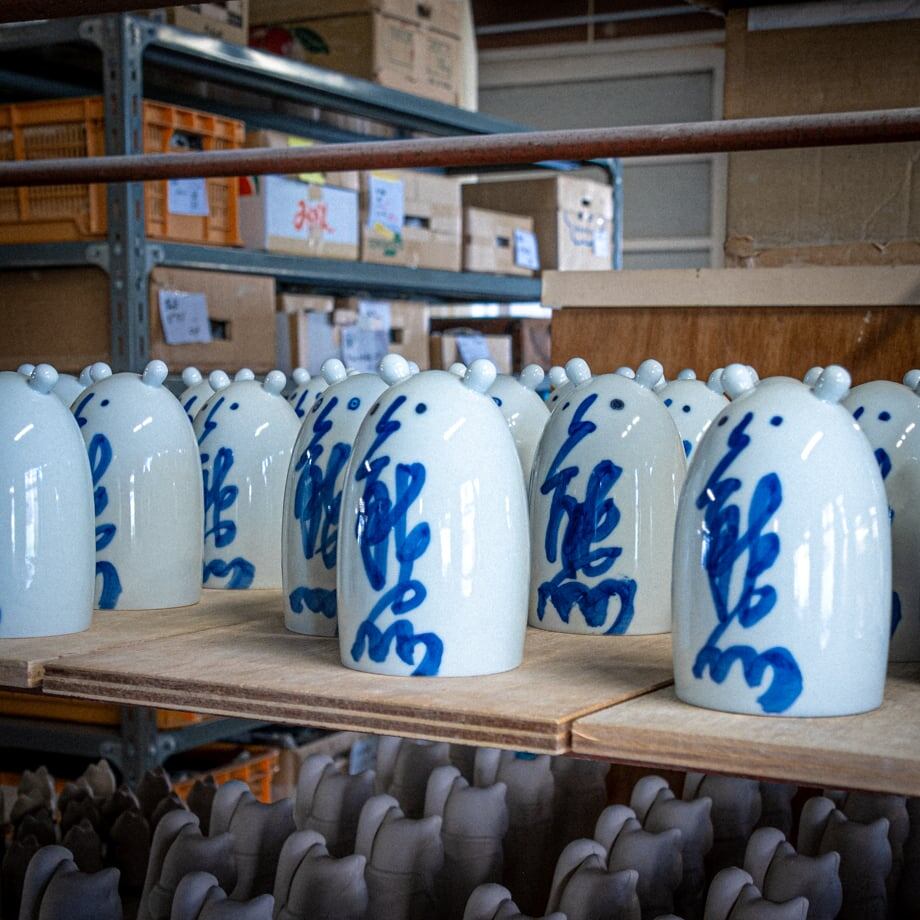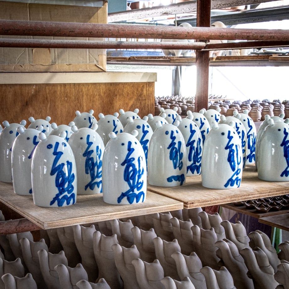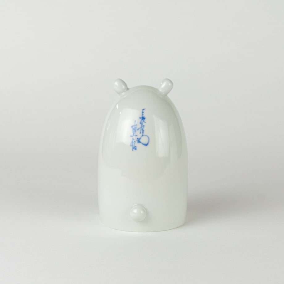轆轤でつくった熊の置物です。六代目の上出惠悟が漢字で「熊」と書いています。「寿」と「フクロウ」をミックスした「寿福老」にちなみ、「熊福老」と名付けました。