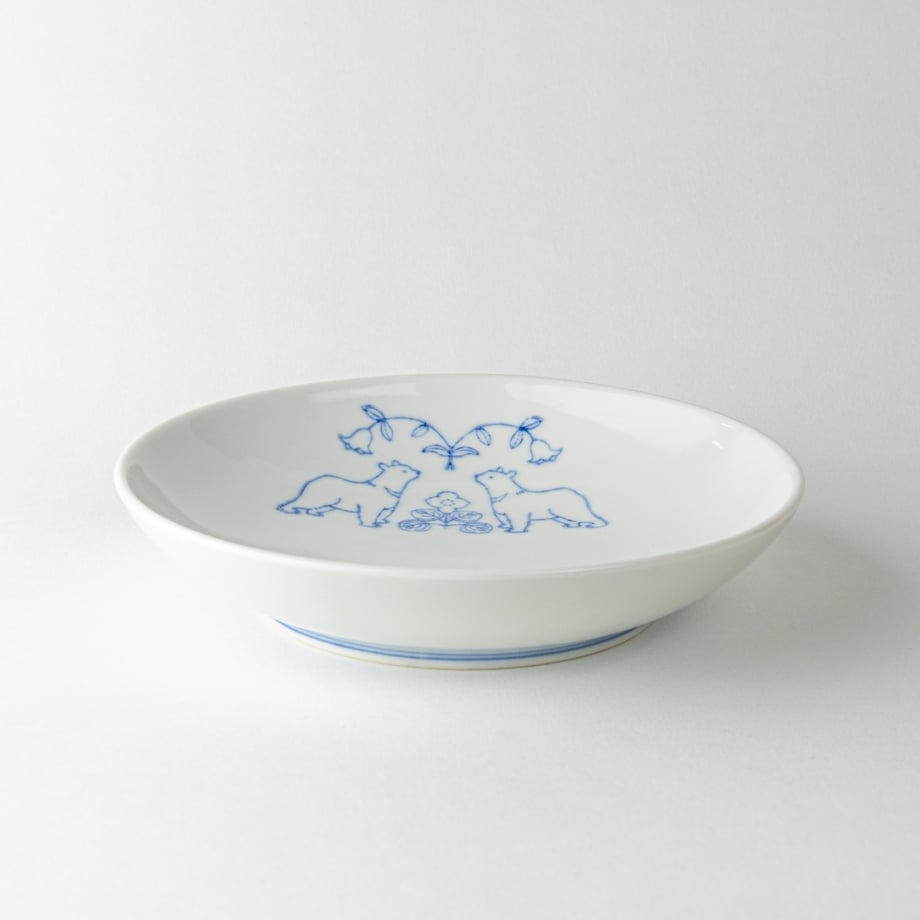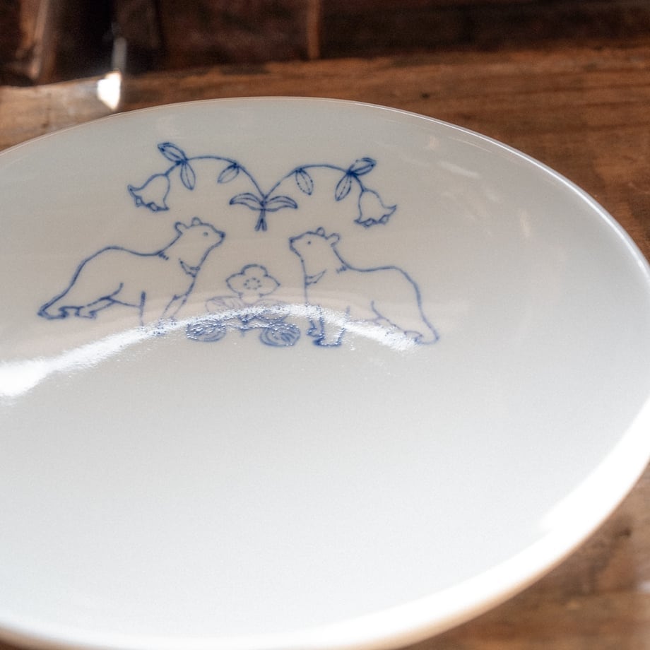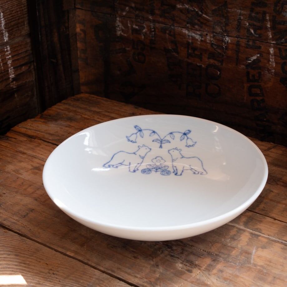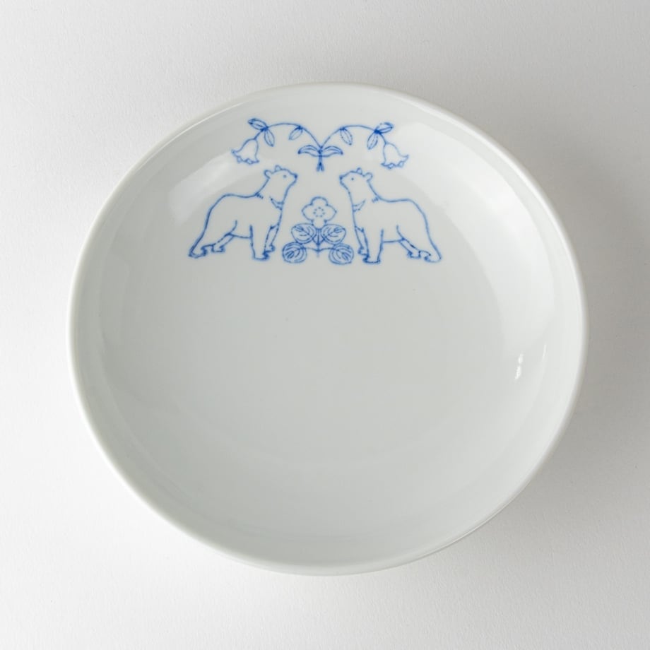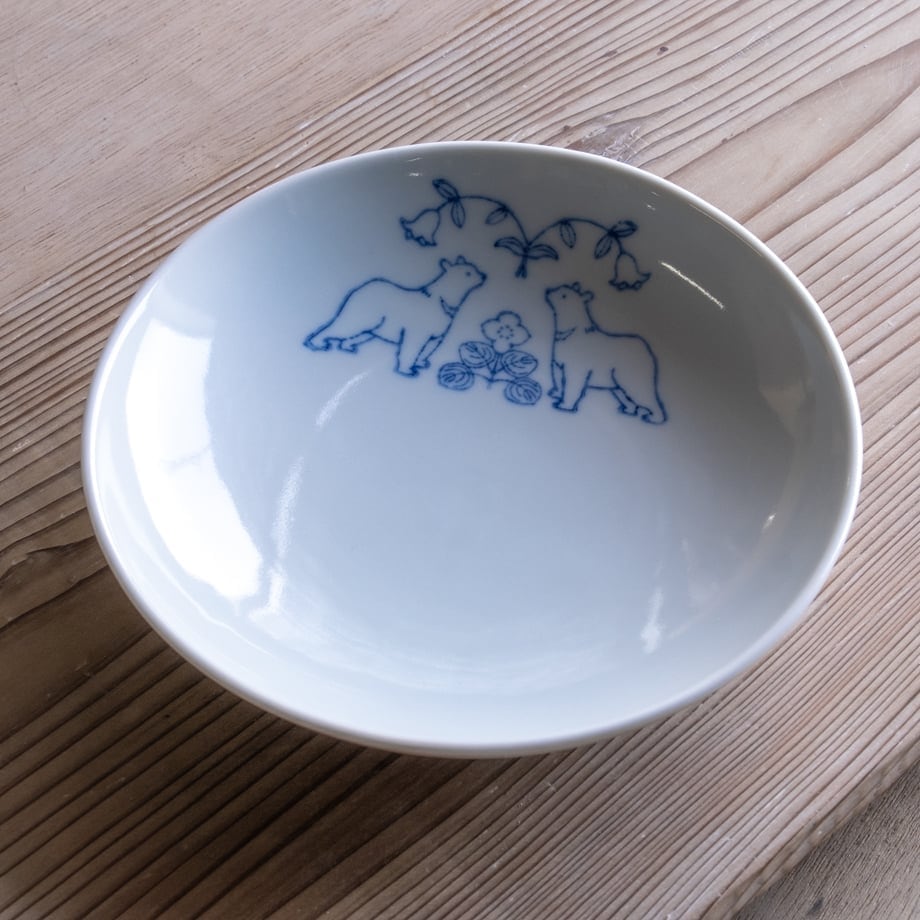 窯まつりで生まれた五寸五分浅鉢 向い雷鳥草花文様を熊まつりバージョンにアレンジ。