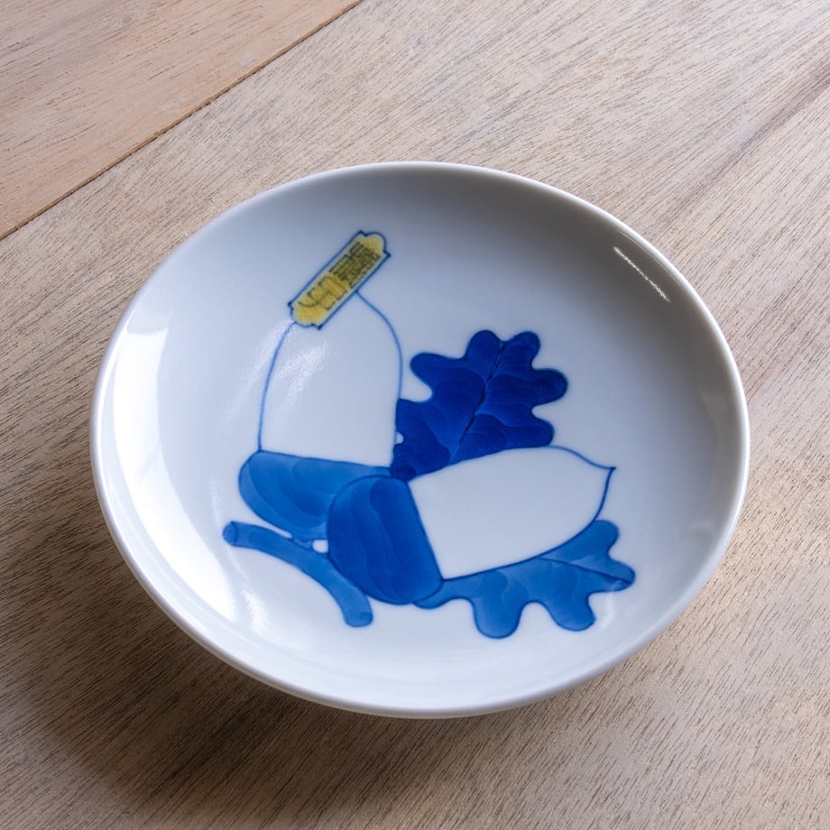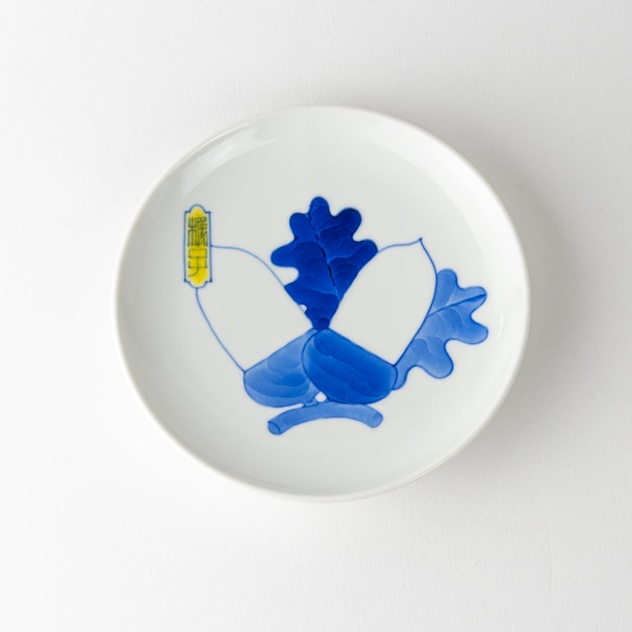 熊が好んで食べる団栗(橡子)を描いた丸皿です。