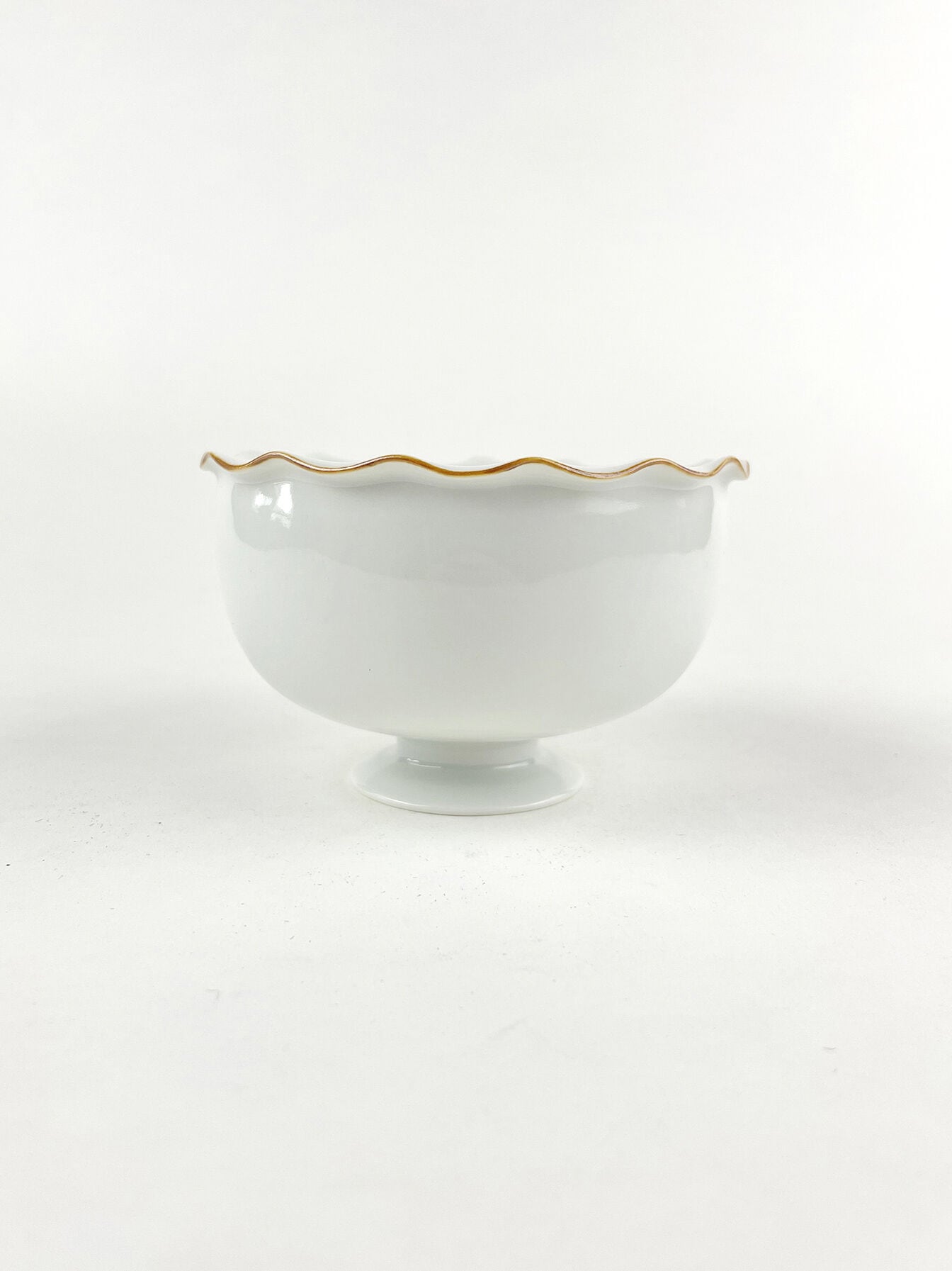 小さなパフェやプリン、白玉だんごなどデザートや甘味を盛り付けたくなる高台付きの器です。とっておきのお料理にも是非お使いください。フチに施した花びらのようなデザインは轆轤で成形した後に、一つ一つ指を押し当てて作っています。