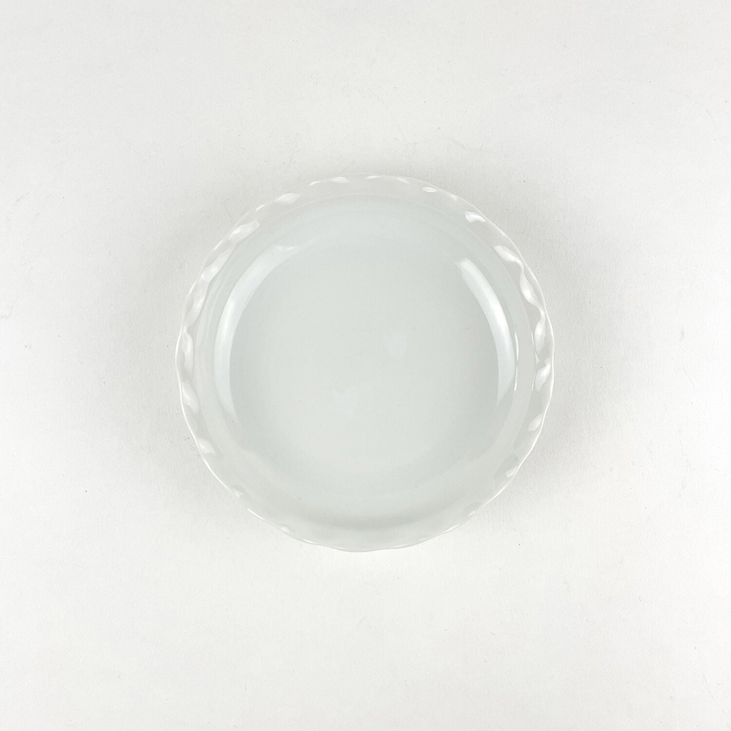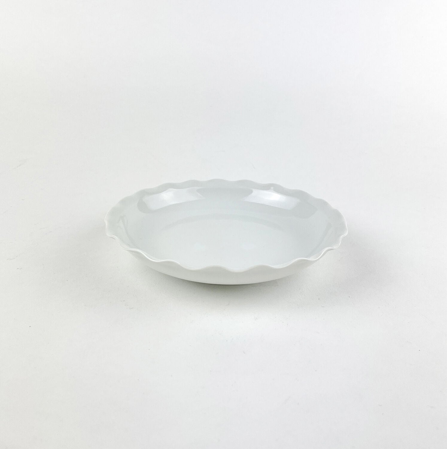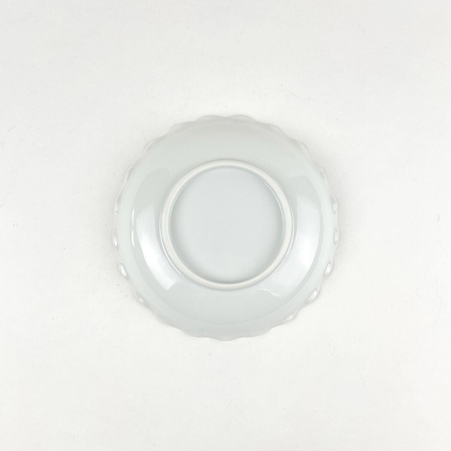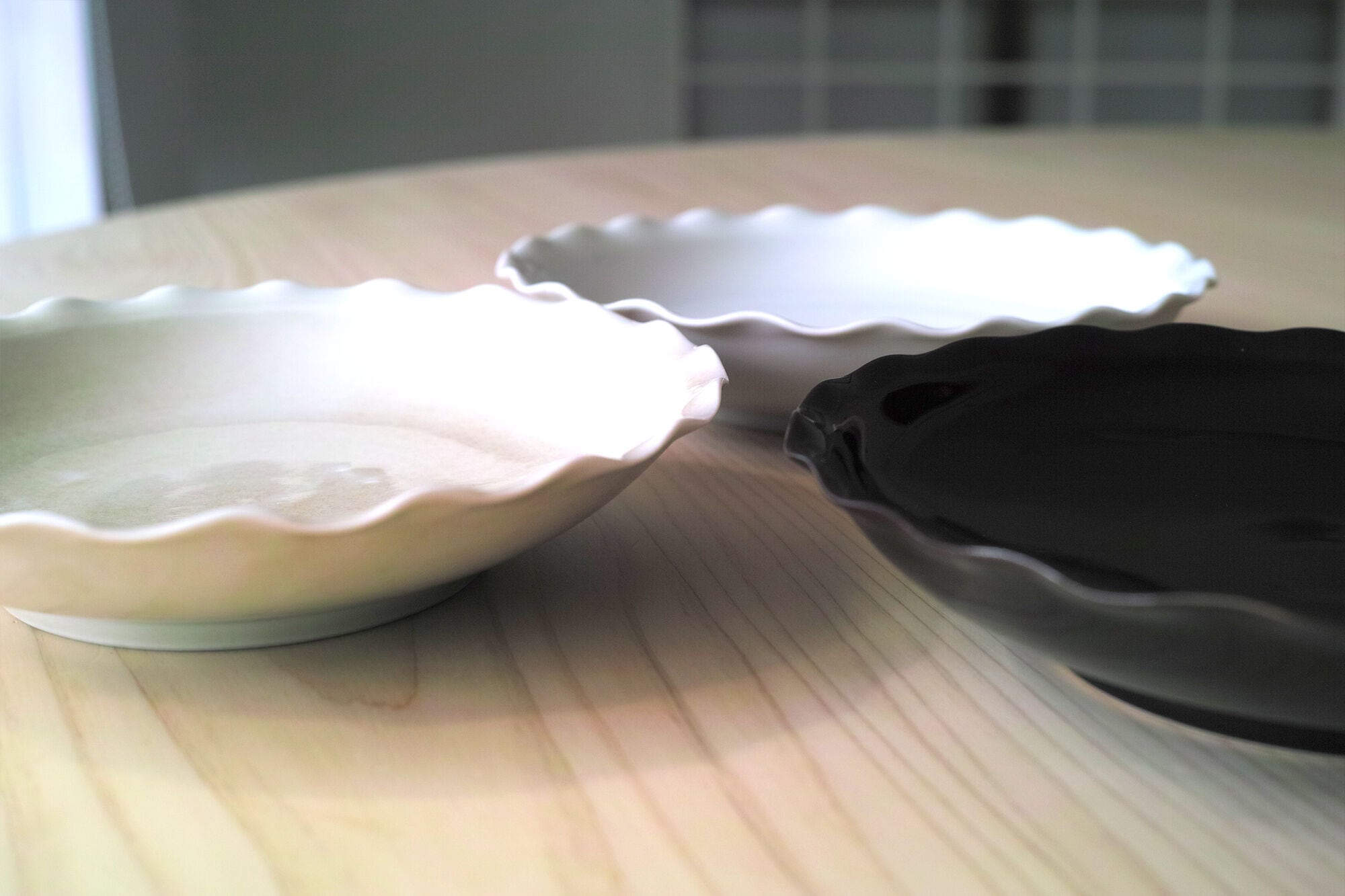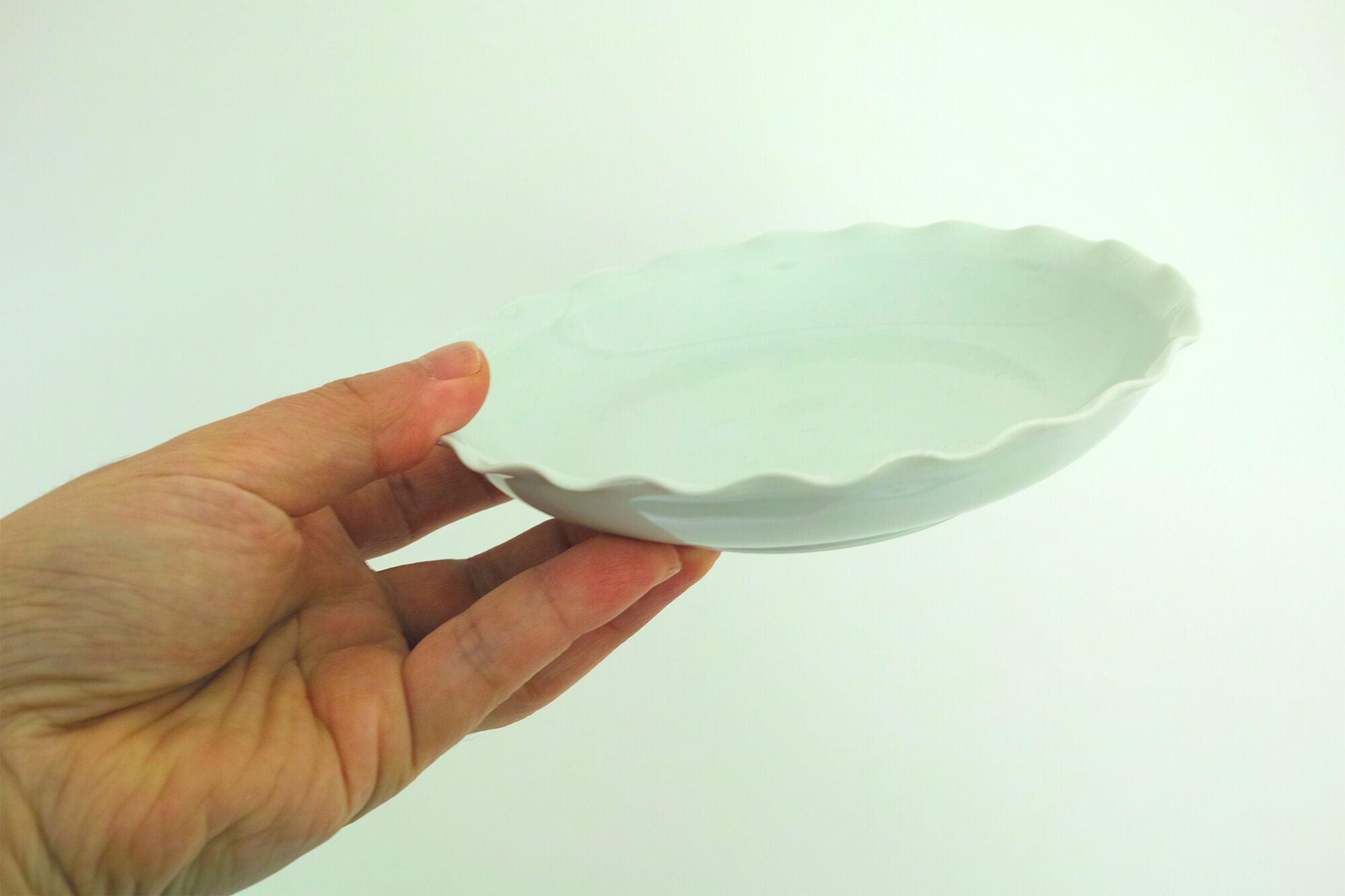 花縁と呼ばれるフチの加工は、轆轤で成形した後、一つ一つ指で押し当てて作り出しています。少々手間のかかる作業ですが、その分華やかな仕上がりとなります。この皿は少し深さがあるので、汁気のある料理も盛り付けるお使いできます。中華にもおすすめです。またサイズ違いで作成したそれぞれのお皿を重ねると入れ子のように美しく収納できます。