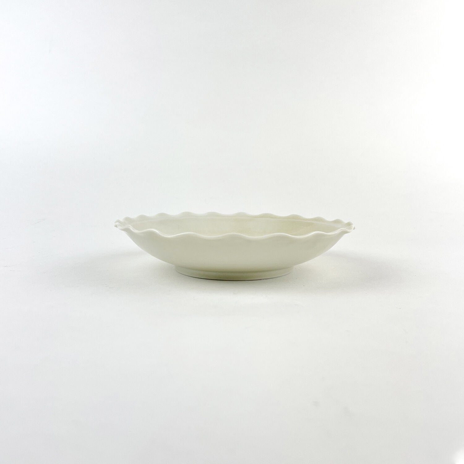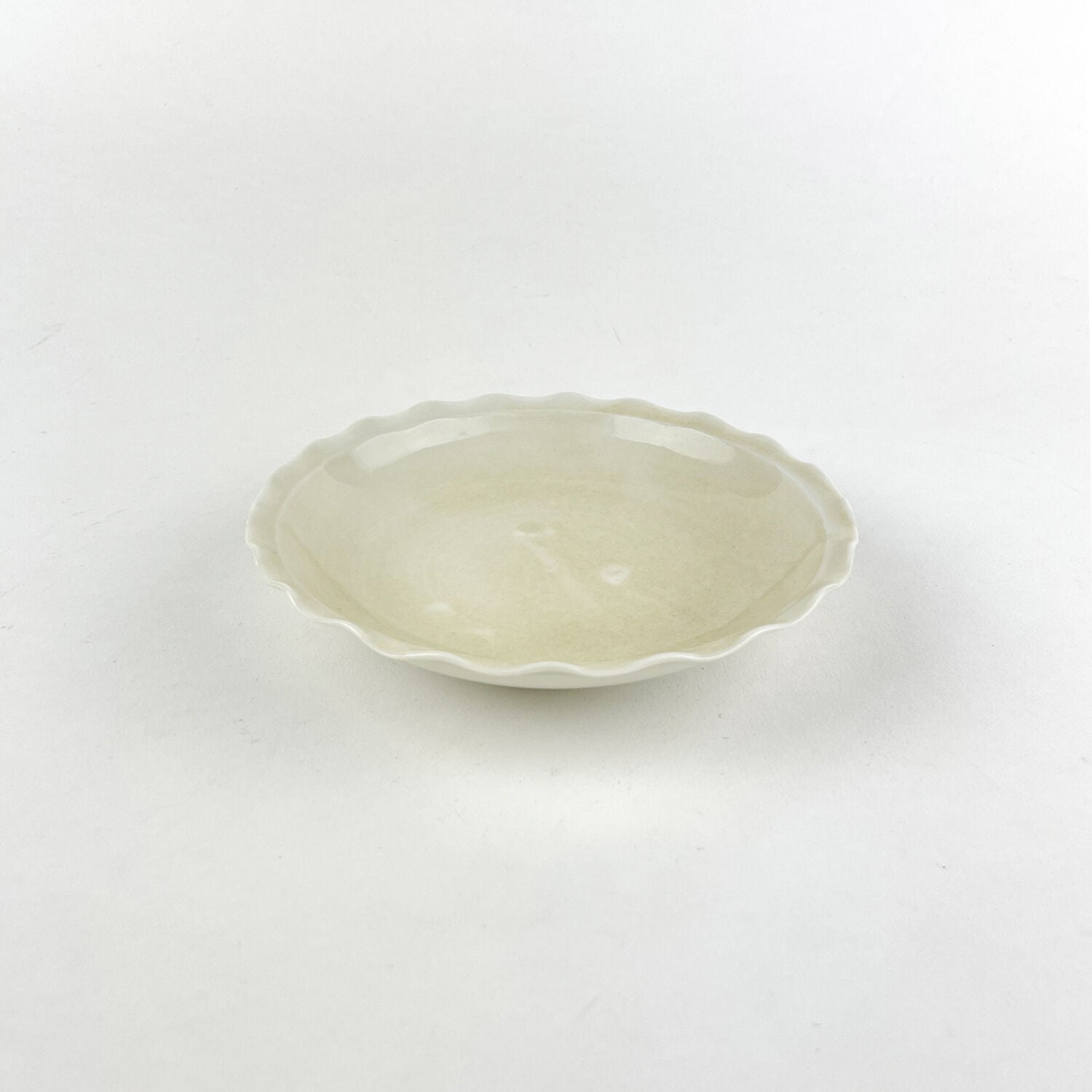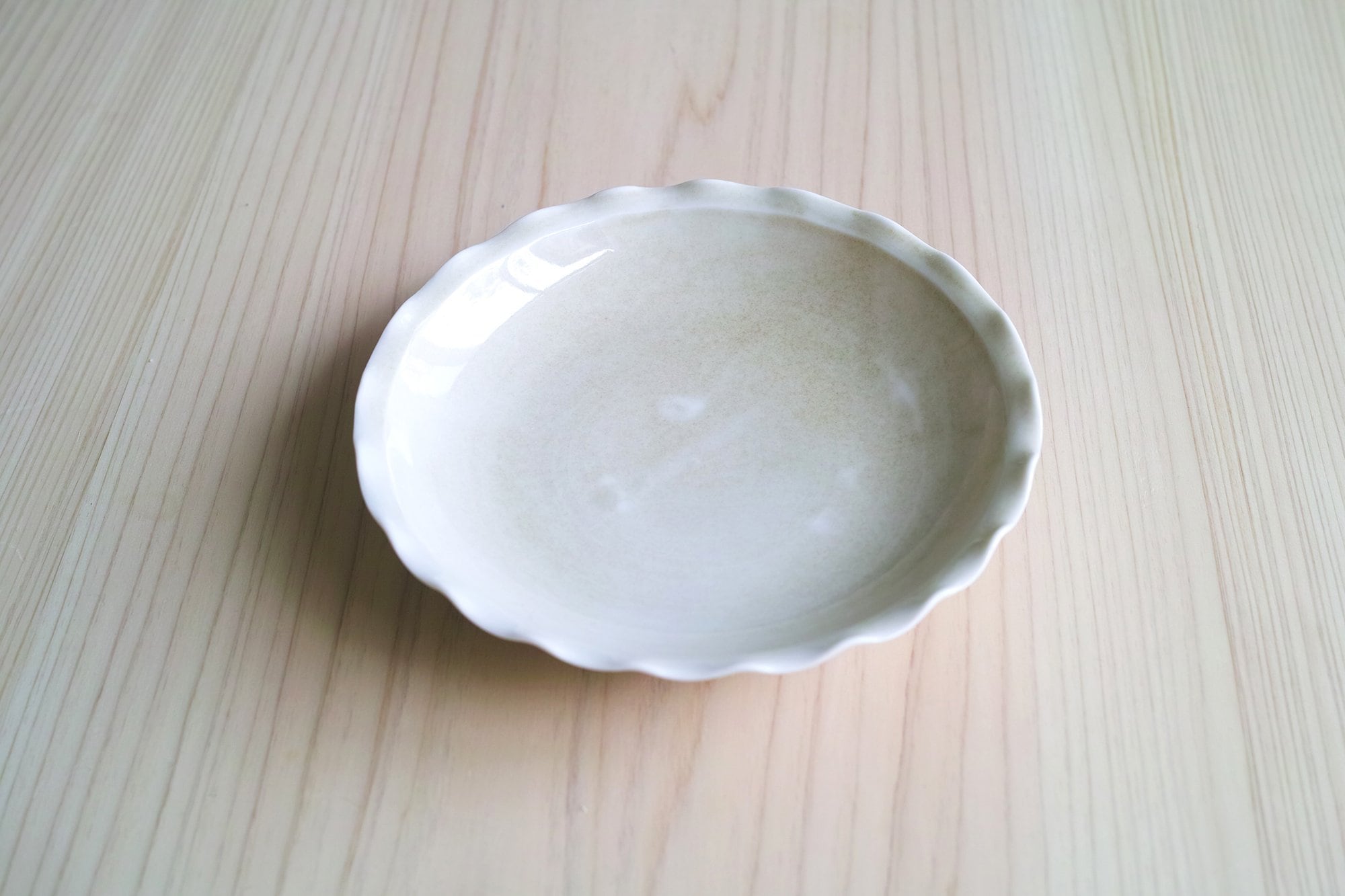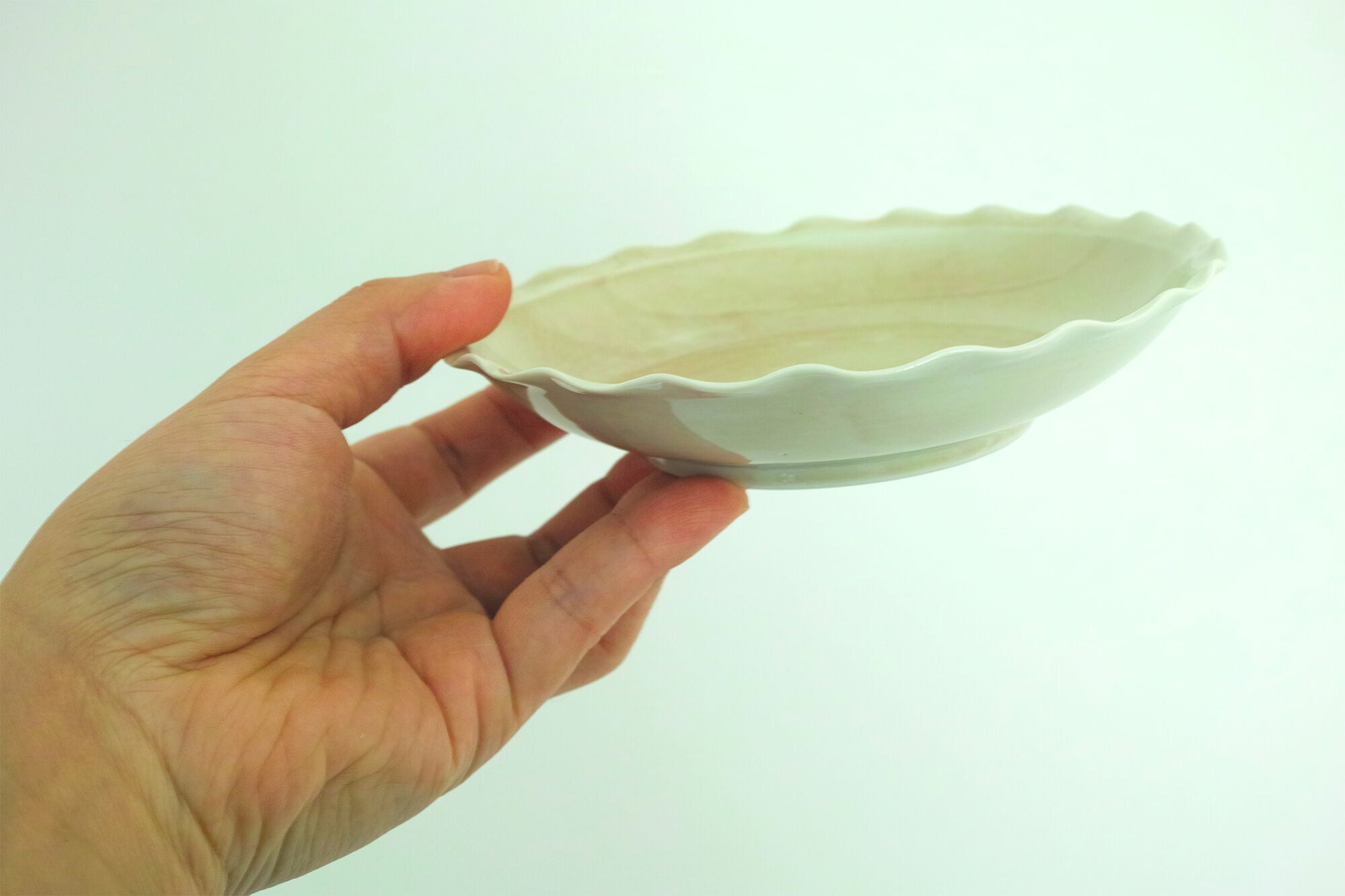 花縁と呼ばれるフチの加工は、轆轤で成形した後、一つ一つ指で押し当てて作り出しています。少々手間のかかる作業ですが、その分華やかな仕上がりとなります。この皿は少し深さがあるので、汁気のある料理も盛り付けるお使いできます。中華にもおすすめです。またサイズ違いで作成したそれぞれのお皿を重ねると入れ子のように美しく収納できます。