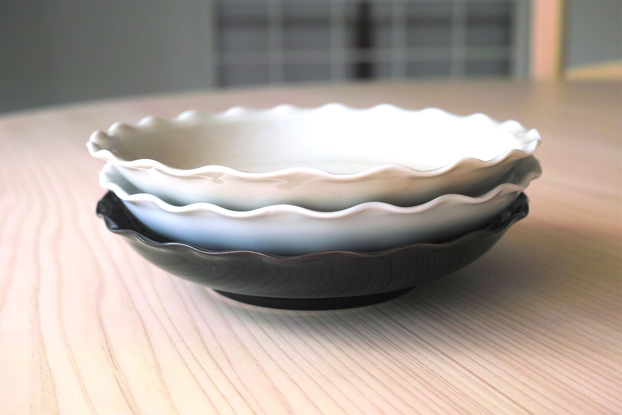 花縁と呼ばれるフチの加工は、轆轤で成形した後、一つ一つ指で押し当てて作り出しています。少々手間のかかる作業ですが、その分華やかな仕上がりとなります。この皿は少し深さがあるので、汁気のある料理も盛り付けるお使いできます。中華にもおすすめです。またサイズ違いで作成したそれぞれのお皿を重ねると入れ子のように美しく収納できます。