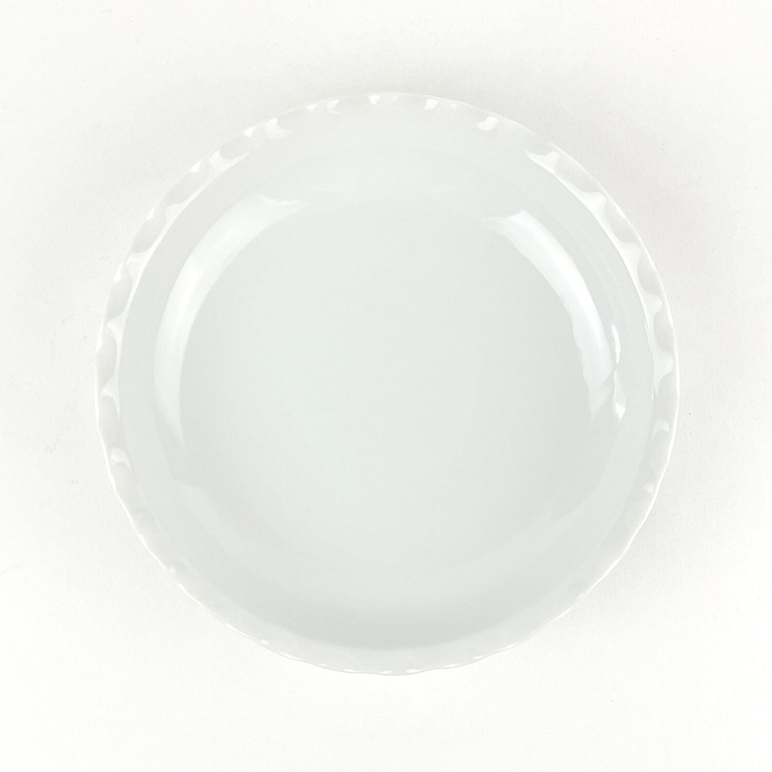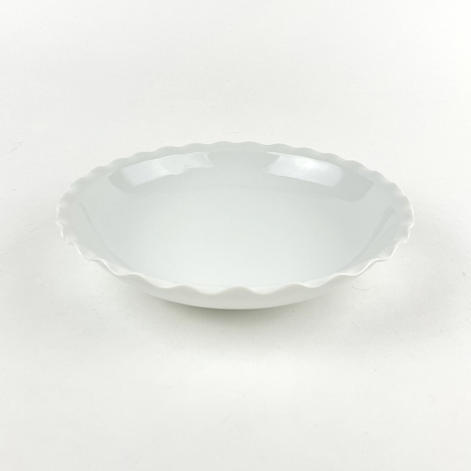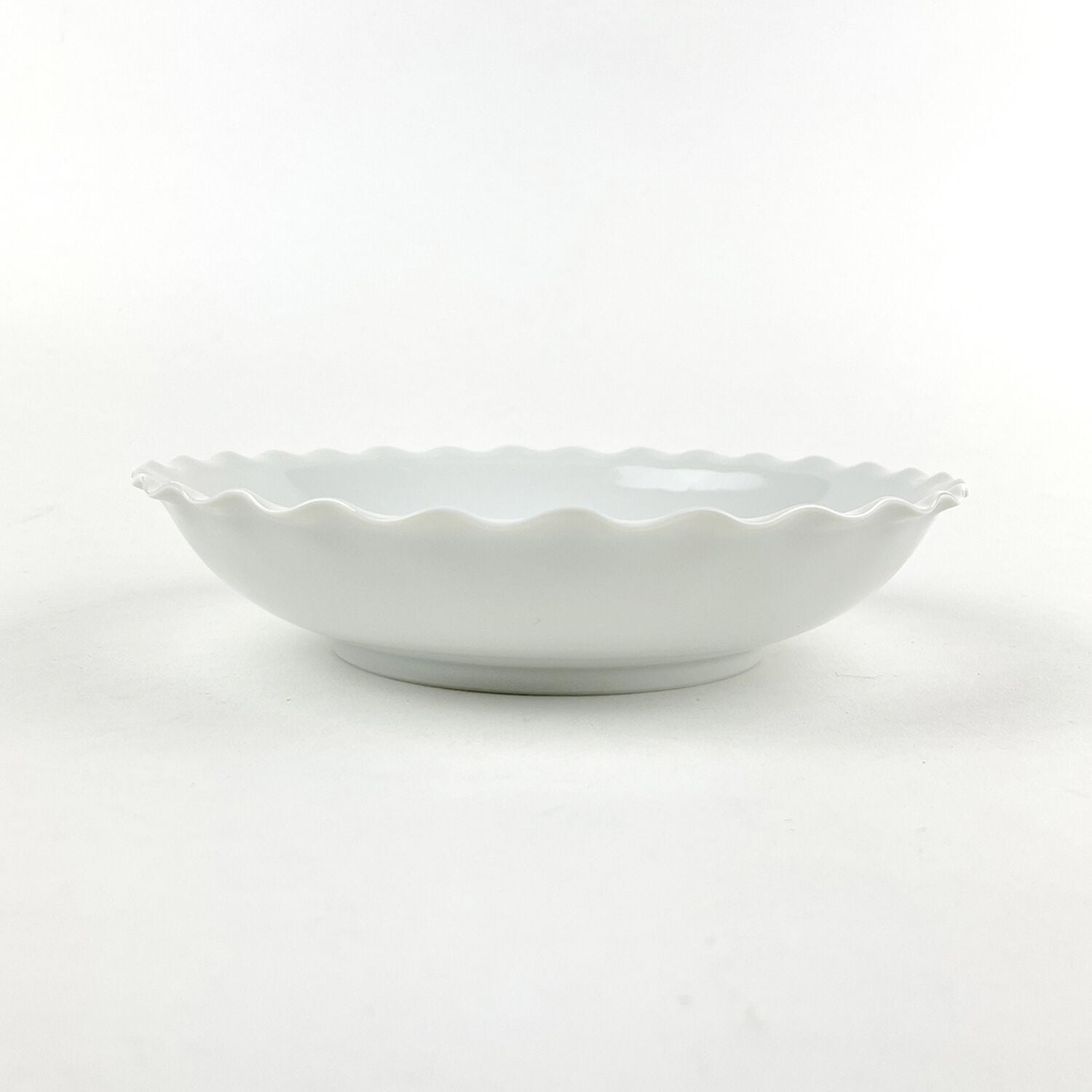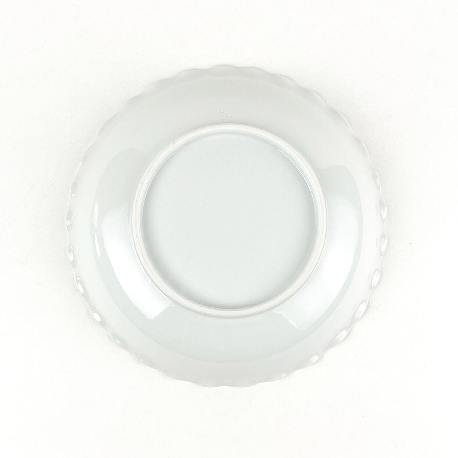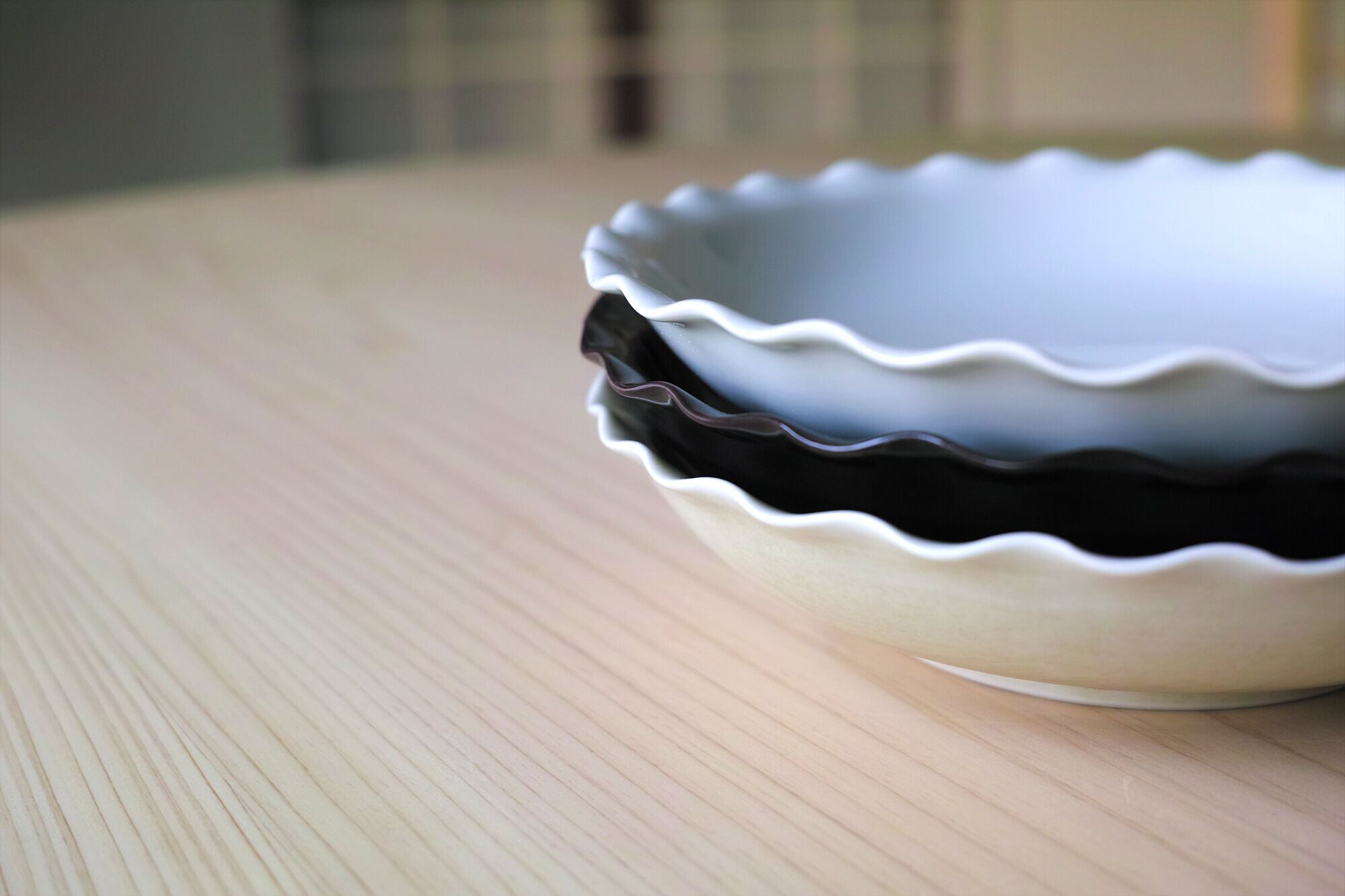 花縁と呼ばれるフチの加工は、轆轤で成形した後、一つ一つ指で押し当てて作り出しています。少々手間のかかる作業ですが、その分華やかな仕上がりとなります。この皿は少し深さがあるので、汁気のある料理も盛り付けるお使いできます。中華にもおすすめです。またサイズ違いで作成したそれぞれのお皿を重ねると入れ子のように美しく収納できます。