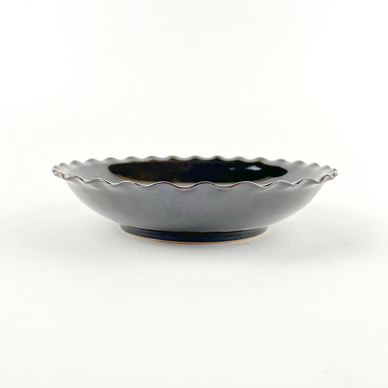 花縁と呼ばれるフチの加工は、轆轤で成形した後、一つ一つ指で押し当てて作り出しています。少々手間のかかる作業ですが、その分華やかな仕上がりとなります。この皿は少し深さがあるので、汁気のある料理も盛り付けるお使いできます。中華にもおすすめです。またサイズ違いで作成したそれぞれのお皿を重ねると入れ子のように美しく収納できます。