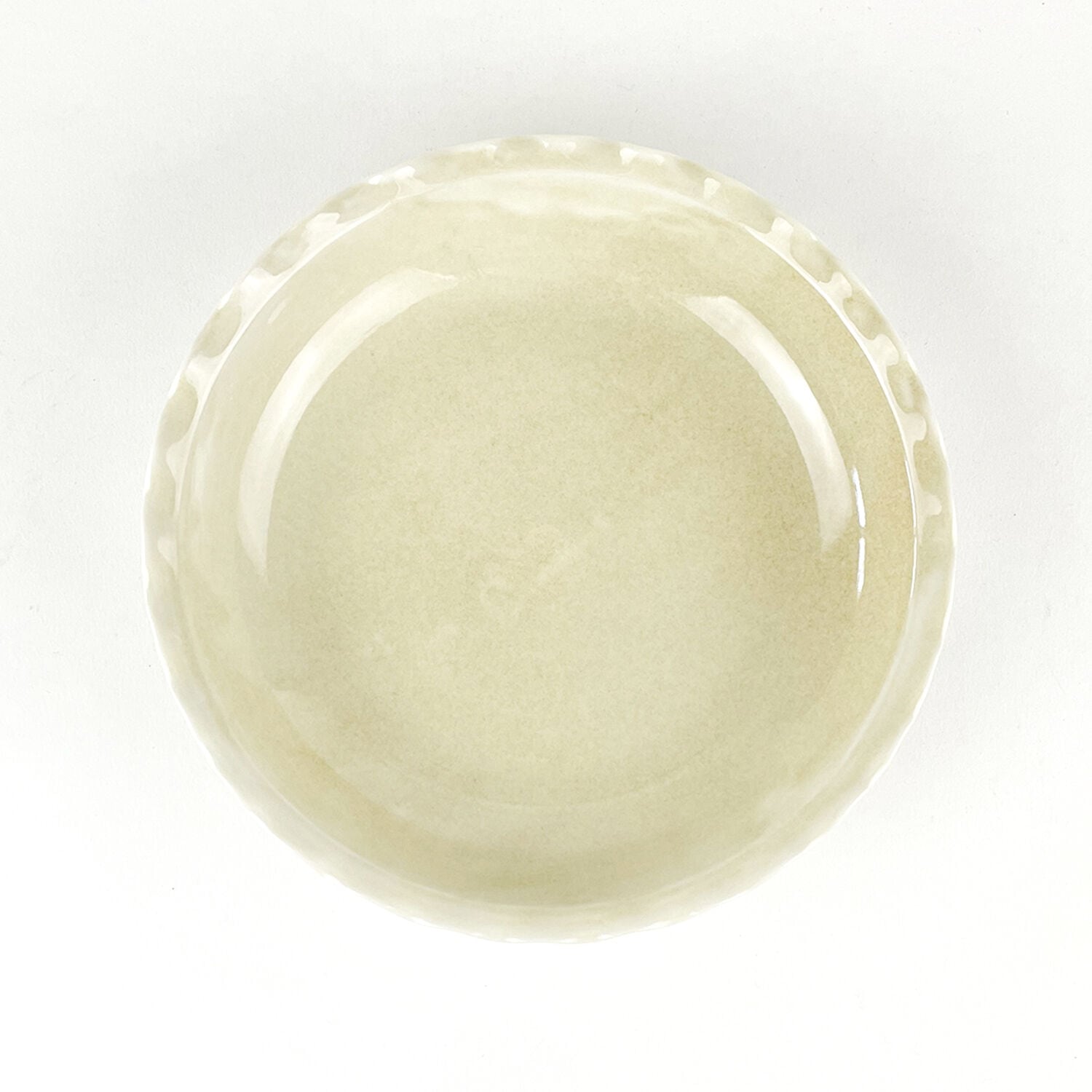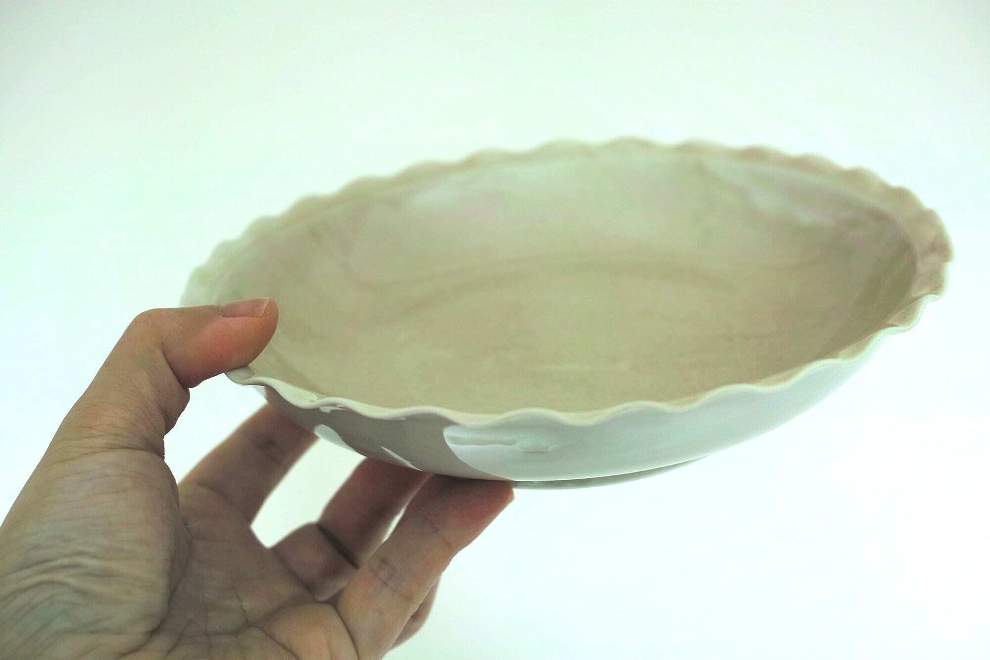 花縁と呼ばれるフチの加工は、轆轤で成形した後、一つ一つ指で押し当てて作り出しています。少々手間のかかる作業ですが、その分華やかな仕上がりとなります。この皿は少し深さがあるので、汁気のある料理も盛り付けるお使いできます。中華にもおすすめです。またサイズ違いで作成したそれぞれのお皿を重ねると入れ子のように美しく収納できます。