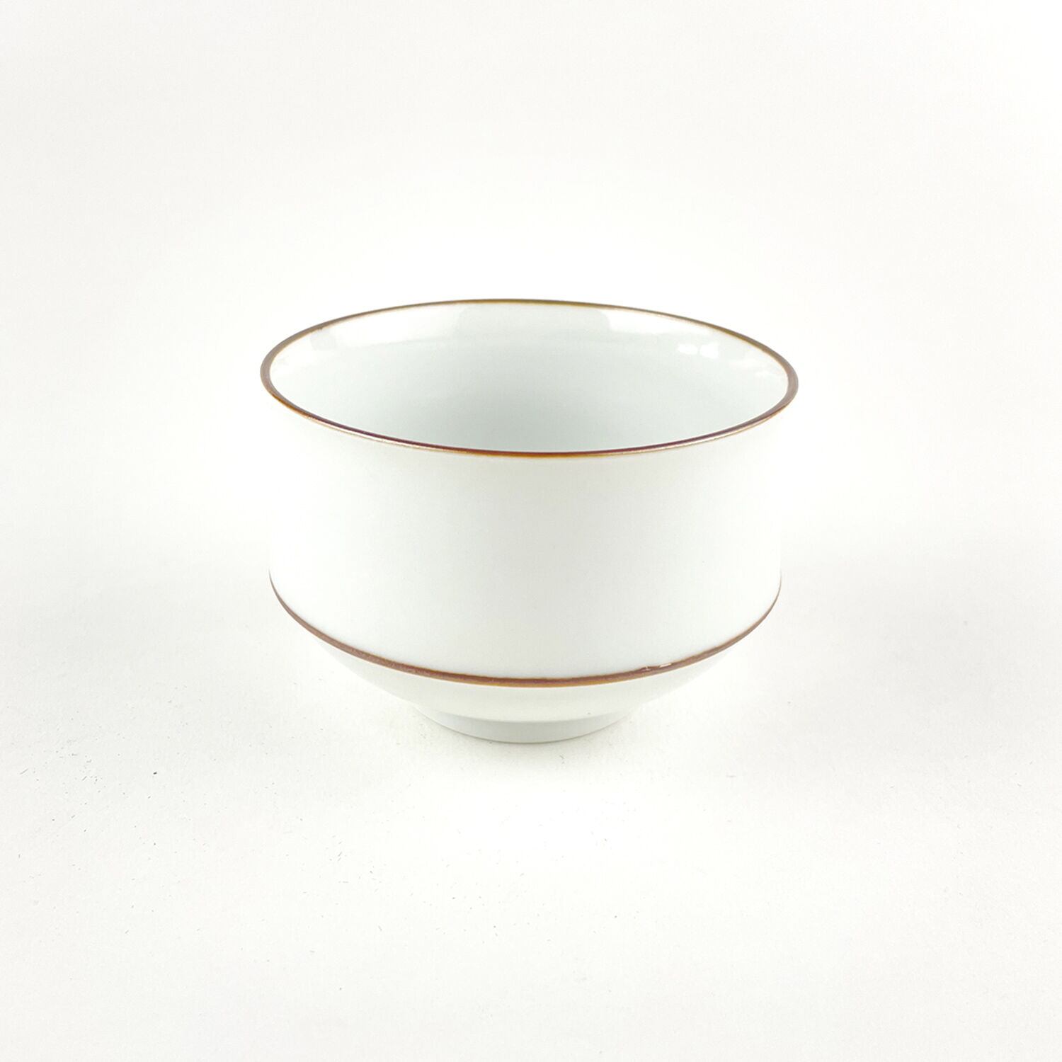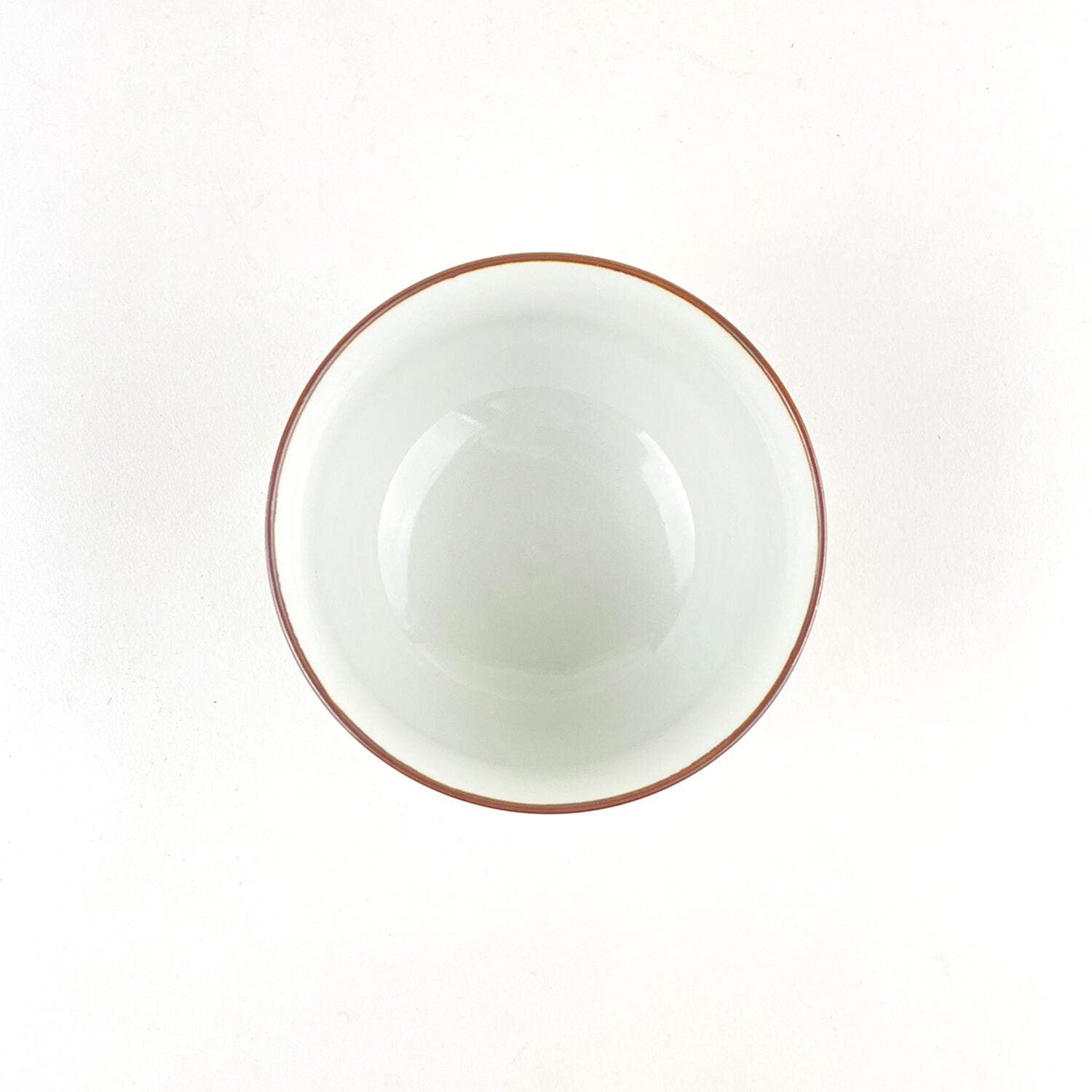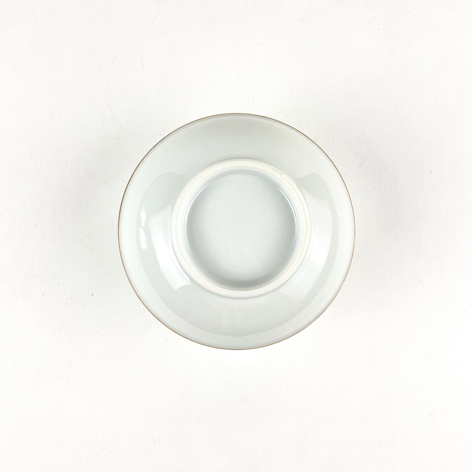 長右衛門窯には、笛吹や祥瑞など中国明時代の染付磁器のデザインから着想を得て作られた器がたくさんあります。この器も同じように明末の名品と呼ばれる茶碗の形を参考に小さく変形させました。スタッキングしやすく、手に馴染む心地よい形です。