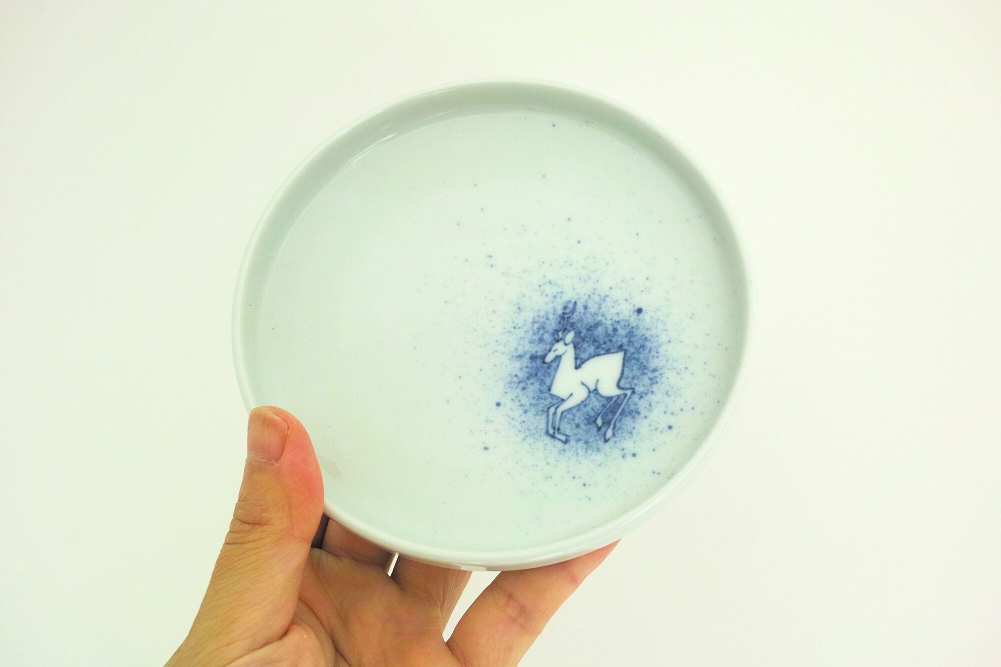 料理人に人気のあるフラットな皿です。「轆轤」の「轆」という字には「鹿」が入っており、ちょうど10月は鹿の鳴く季節でもあるので、轆轤まつりのビジュアルイメージには鹿の挿絵を描いています。