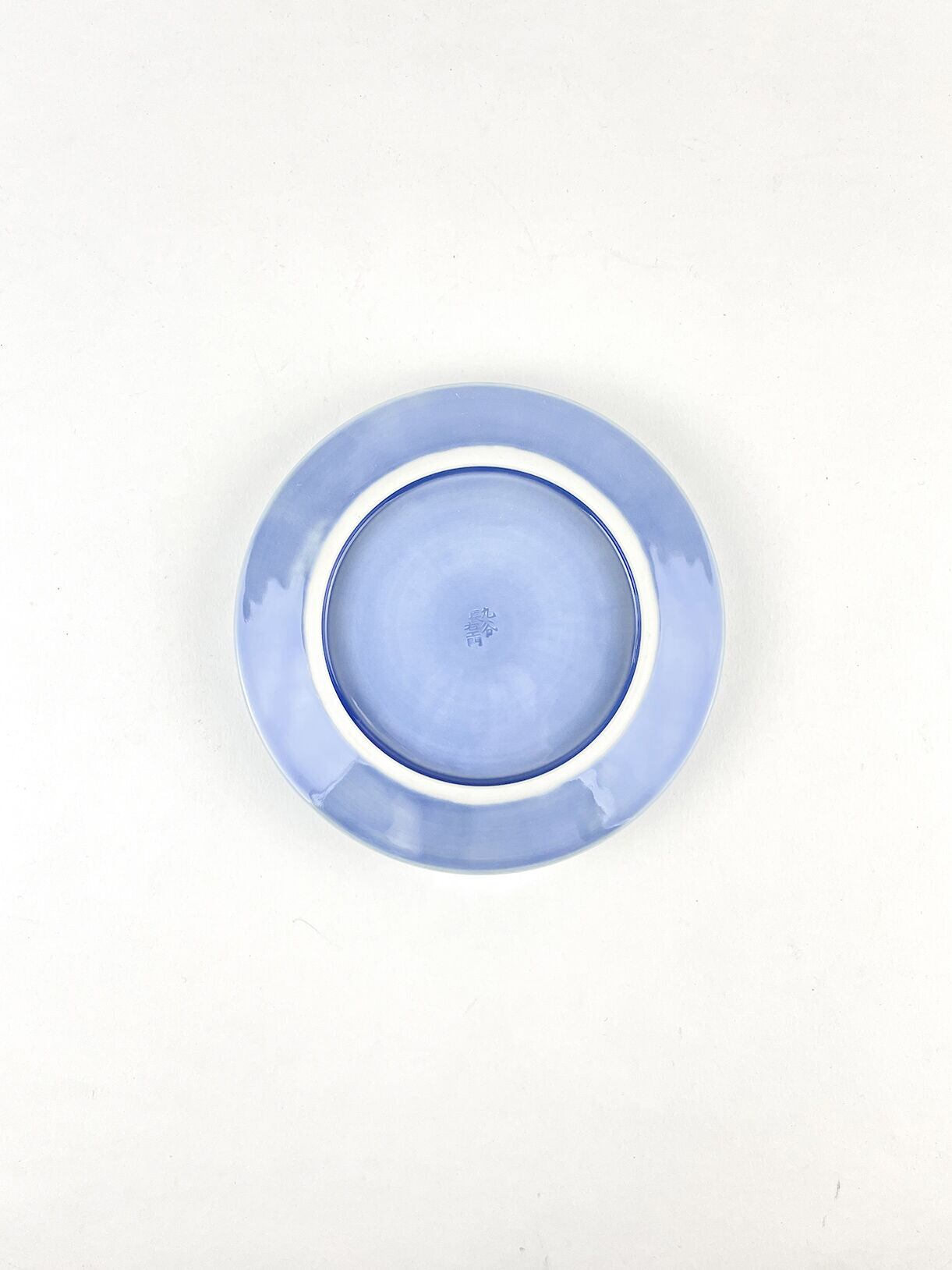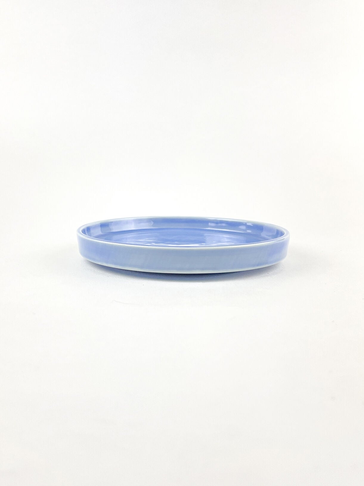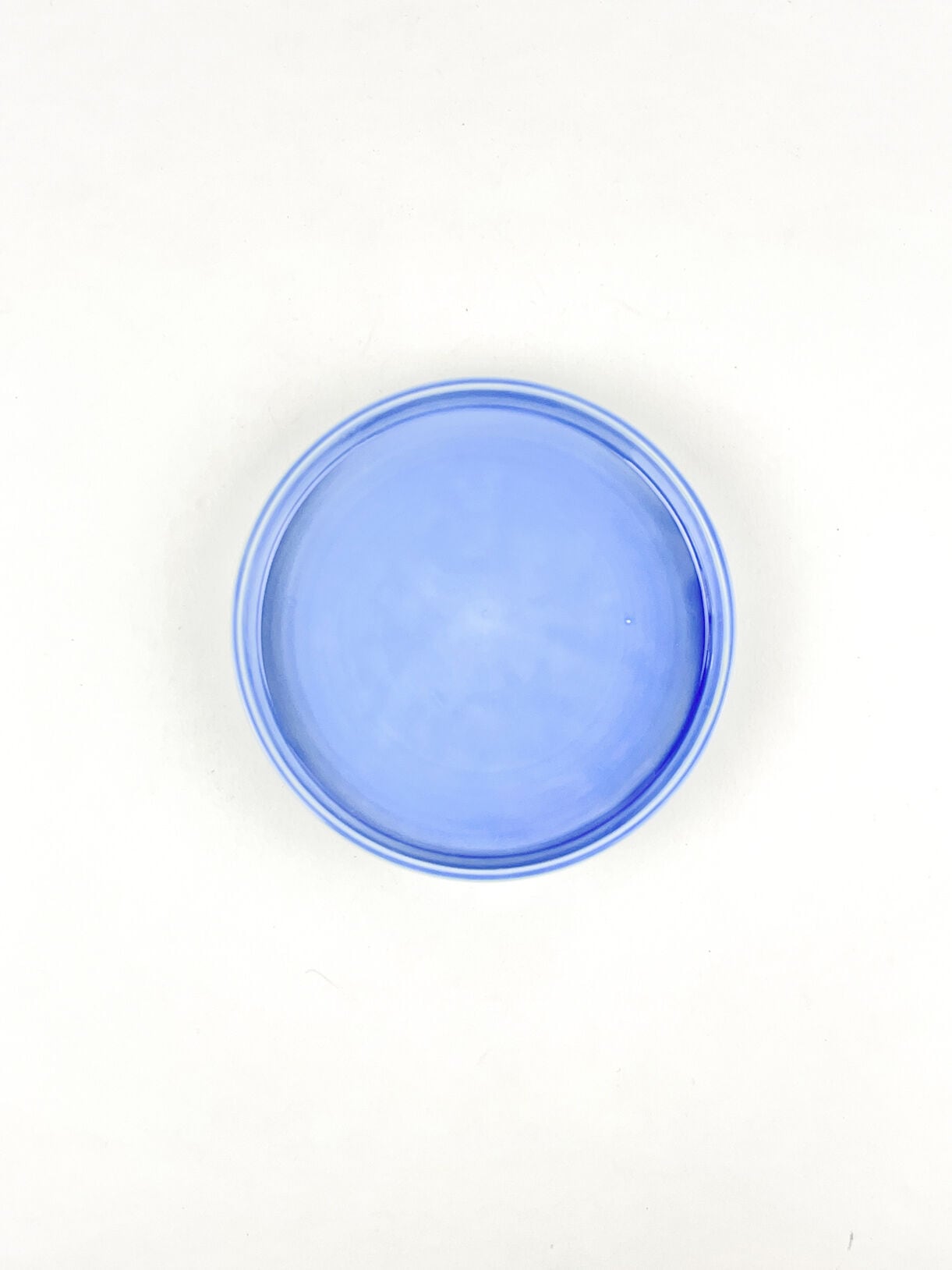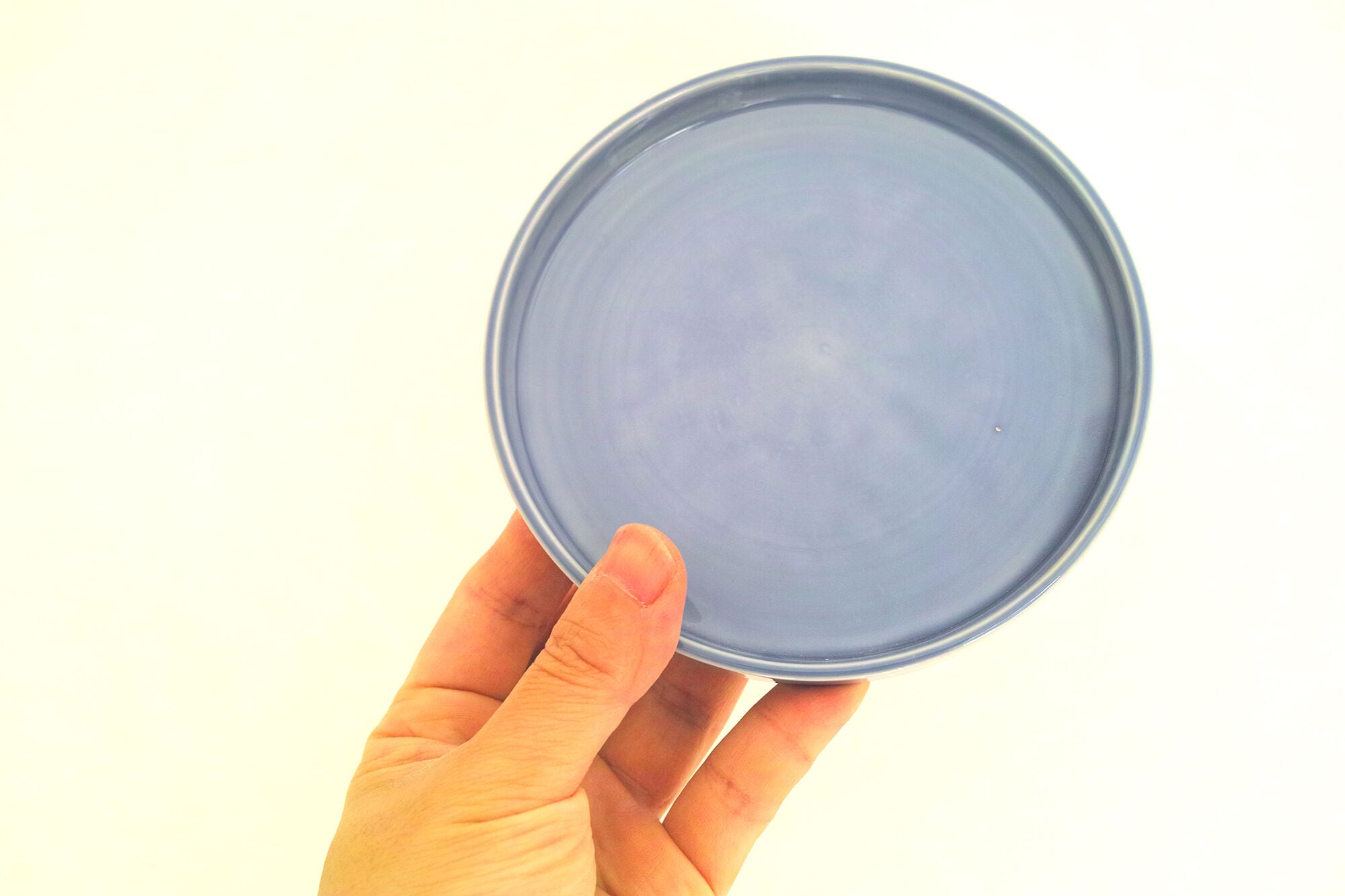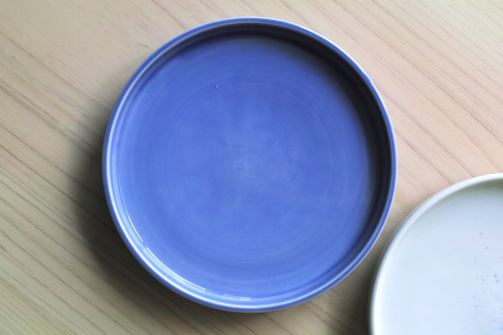 料理人に人気のあるフラットな皿です。瑠璃釉は染付を釉薬に溶かして作った青色の釉薬です。